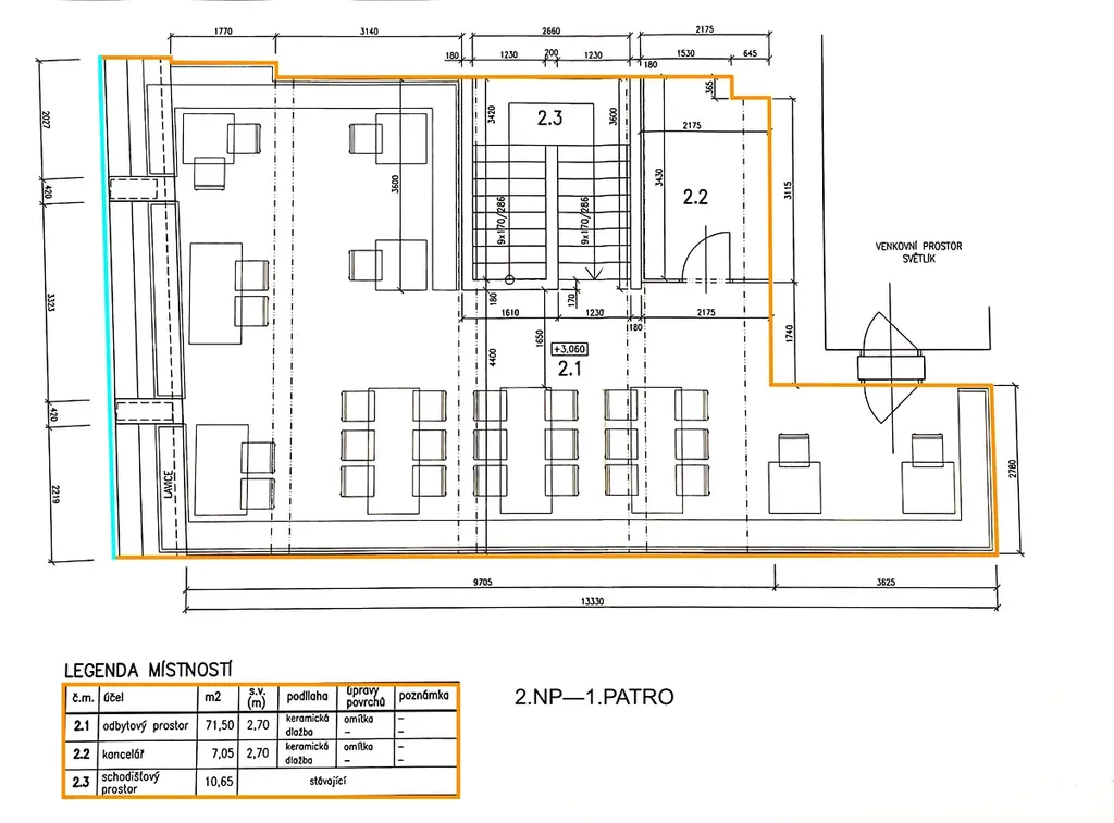 V prvním patře je převážně nečleněný prostor s velkými okny do náměstí a s jednou oddělenou kanceláří.