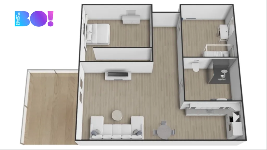 Dispozice bytu je velmi praktická a vzdušná. Dominantou je obývací pokoj propojený s kuchyní, který vytváří příjemný společný prostor. Dále je zde koupelna s WC a dva samostatné pokoje, z nichž jeden disponuje vlastním šatním prostorem.