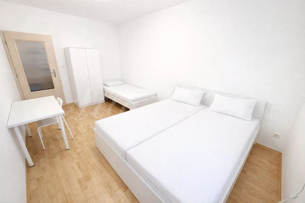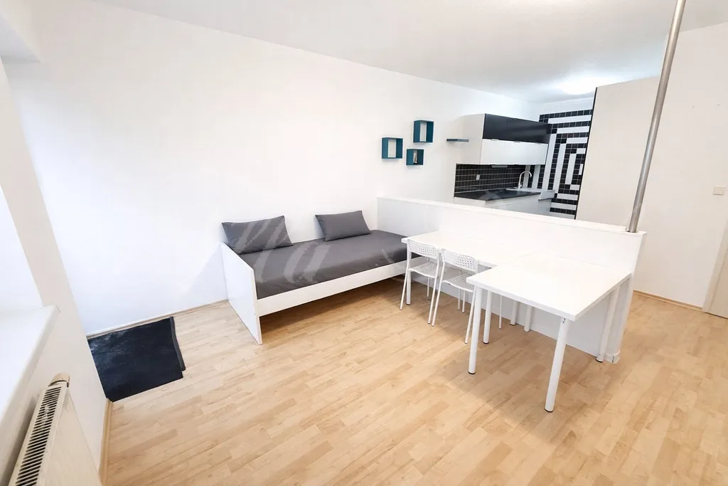 Zařízení: moderní kuchyňská linka s vestavěnými spotřebiči: lednice, trouba, mikrovlna trouba, myčka nádobí, varna deska digestoř, pračka, 4 lůžka, šatní skříně, pracovní stůl, židle, na chodbě šatní skříně, botník. Nábytek, který je na fotkách muže zůstat, nebo lze vystěhovat. V koupelně vana, a WC, pračka. Do bytu je zavedený internet není v ceně nájmu. Na podlaze dlažba a plovoucí podlaha, plastová okna, žaluzie. V přízemí společná kočárkárna. Možnost parkovaní před domem. Dostupnost MHD: Autobus 511. K dispozici ihned