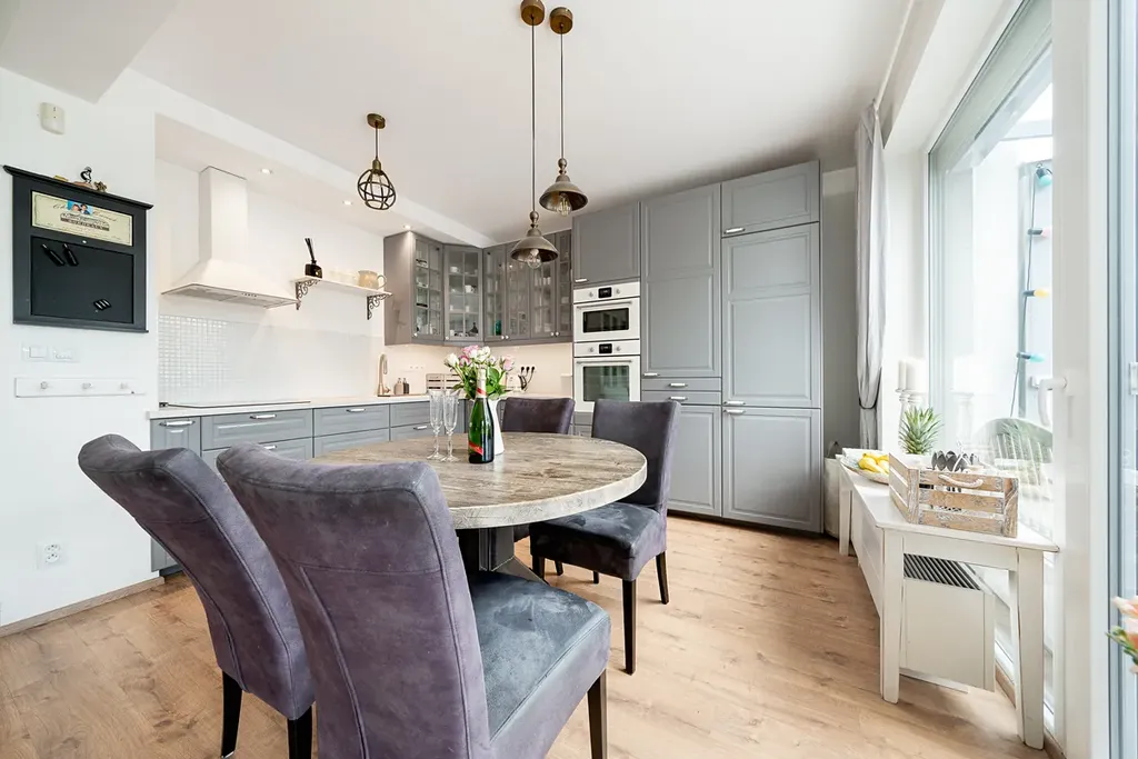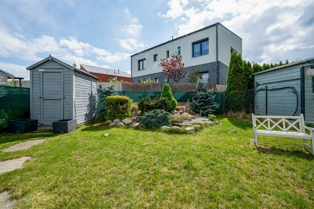 Nabízím k prodeji trendový řadový rodinný dům s dispozicí 5+kk a garáží,pozemek 290 m s užitnou plochou 138 m2,zahradou za domem o výměře 145 m2, a terasy 8,5m , dalším pozemkem před domem o velikosti 43 m2 v jihozápadní části Prahy 12, Cholupice. Dům je součástí rezidenční klidové zóny obce, vystavěné postupně v roce 2015. Dům samotný je patrovou, nepodsklepenou zděnou stavbou s rovnou a mírně šikmou střechou. Dispozice domu je rozdělena do dvou podlaží. Přízemí domu s hlavním vstupem do domu a integrovanou garáží, je řešeno jako 1+kk a je společenským patrem celého domu. Zádveří domu je prostorné natolik, že je zde prostor pro šatnu i technické zázemí domu. Obývací pokoj s elektrickým krbem je volně průchozí s kuchyňským koutem a tvoří tak jeden otevřený prostor. Příjemným bonusem je přímý vstup na zahradu domu a zastřešenou terasu s venkovním posezením. Zahrada za domem je klidným místem pro venkovní posezení s rodinnou a grilování s přáteli. Kuchyně je vybavena moderní kuchyňskou linkou v šedém dřěvěném provedení s vestavnými spotřebiči. Součástí podlaží je také koupelna vybavená sprchovým koutem, umyvadlem, zrcadlem a wc. V 1.NP propojeným s přízemím schodištěm se dřevěnými nášlapnicemi, se nachází 4 ložnice, dvě s orientací do zahrady, dvě do ulice. Dále pak prostorná koupelna s vanou, dvěma umyvadly, zrcadlem. V této koupelně je dostatek místa, tak je zde i pračka a sušička. Dále pak samostatné wc. Je to klidová část domu. Každý z pokojů má velké francouzské okno s nerušícím výhledem do zahrady nebo okolí domu. Rodičovská ložnice pak nabídne navíc šatnu oddělenou posuvnými dveřmi. Dům je napojen na všechny dostupné IS a primárním zdrojem tepla je plynový kotel s radiátory. K základním standardům domu patří kvalitní okna, plovouci vinylová podlaha a dlažba...v oknech bezpečnostní hliníkové žaluzie. Stejně tak optický kabel nebo zabezpečovací zařízení. Dum je prodáván včetně veškerého vybavení a luxusního dřevěného nábytku na míru, jako například knihovna v obývacím pokoji, 2x dětský pokoj s vybudovaným patrem na spaní, king size postel 220x200cm s vysokým čaloněným čelem, vybavený pokoj pro hosty atd Prochazkou je možné se vydat do lesů a parků v nejbližším okolí. Modřanská rokle, hriste a letiste Točná, cyklostezky. Stejně tak za aktivním odpočinkem, tenis, jízda na koni, fotbal, apod. Městská část Cholupice, je místem s výbornou dopravní dostupností. Zastávka busu linky č.341 je 1 min. v pochozí vzdálenosti od domu. Bus je za 8 minut na tram c.17,3,21 spojení s centrem Prahy za 15min. Autem je perfektní dostupnost i na Smíchov a Anděl cca 15 min, kousek je nájezd na Pražský okruh. Základní služby občanské vybaveností jsou v dosahu a otázkou pár minut autem nebo MHD v Modřanech. Obec Cholupice je v posledních letech velice vyhledávanou lokalitou pro bydlení, a to i díky své klidové podobě a možnostem aktivního života a přitom na dosah vymoženostem Prahy. Možné financovat hypotečním úvěrem.. Více na osobní schůzce a prohlídce.