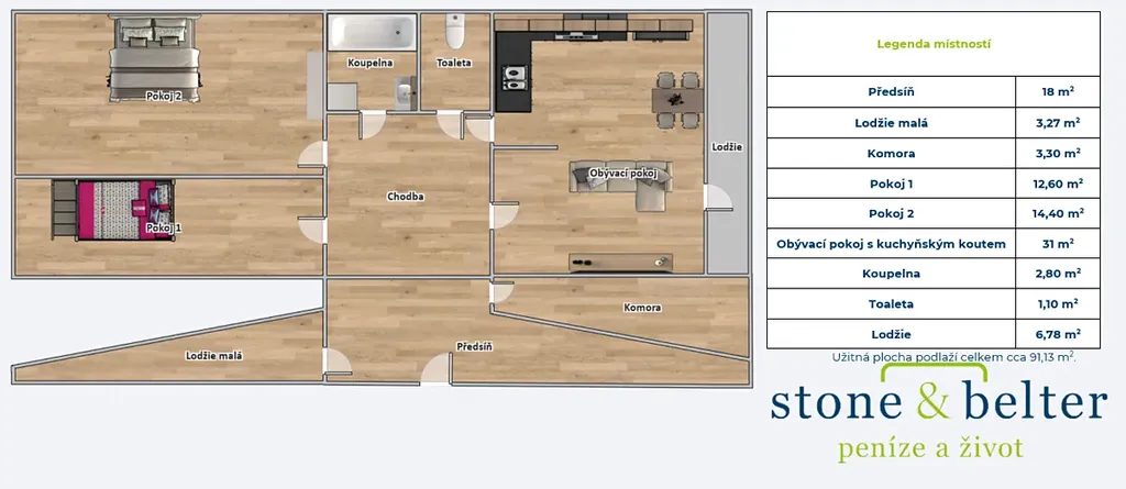 Dispozice bytu je praktická a funkční. Dominantou je prostorný obývací pokoj s kuchyňským koutem a přímým vstupem na velkou lodžii orientovanou na východ (cca 6 m²). Byt dále nabízí dva samostatné neprůchozí pokoje orientované na západ, koupelnu a samostatné WC. K dispozici jsou dvě lodžie – zasklená lodžie orientovaná na jih (cca 2,3 m²) a prostorná lodžie po celé délce obývacího pokoje na východ.