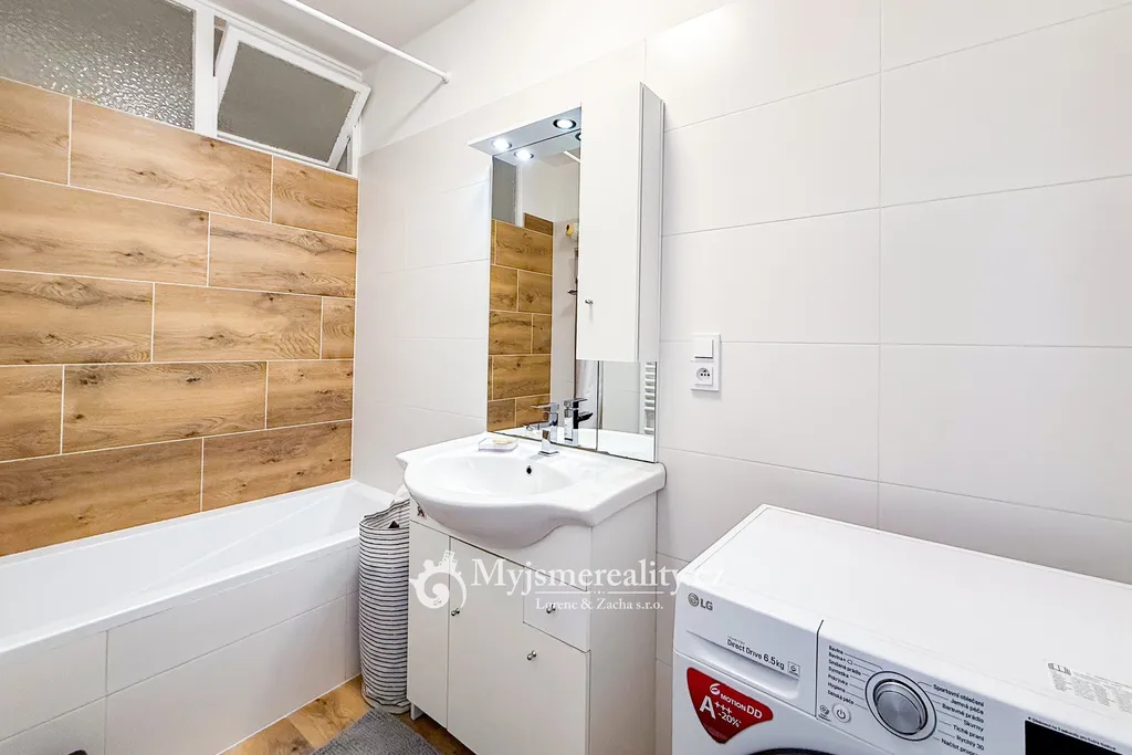 Byt se nachází ve 2. nadzemním podlaží a nabízí praktickou dispozici: předsíň, ložnici, obývací pokoj, samostatnou kuchyni částečně propojenou s obývacím pokojem, koupelnu s vanou a samostatné WC. Součástí bytu je kuchyňská linka s vestavnými spotřebiči a vestavné šatní skříně. V roce 2024 prošel byt kompletní rekonstrukcí včetně nových rozvodů elektřiny, vody a odpadů. Vytápění i ohřev vody jsou centrální. K bytu náleží také sklep (cca 2 m²).
