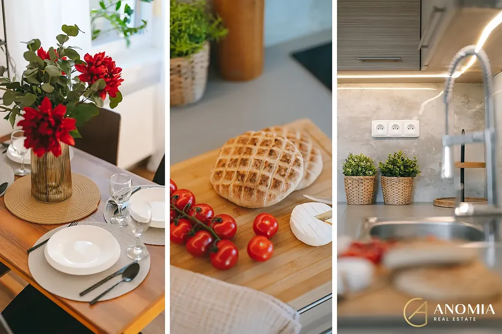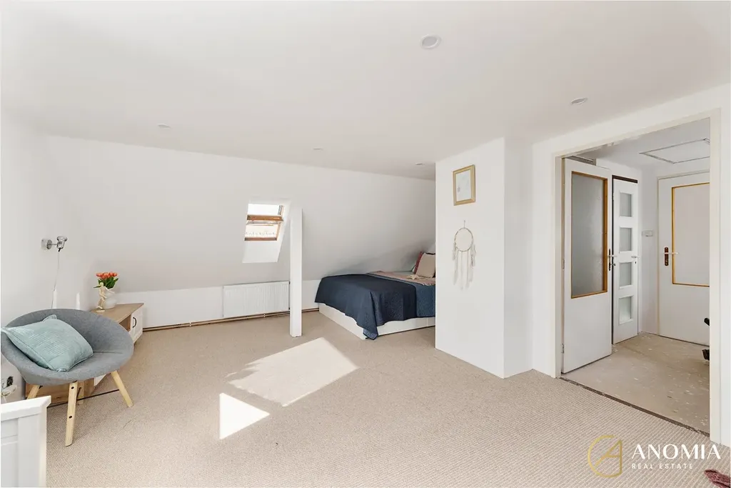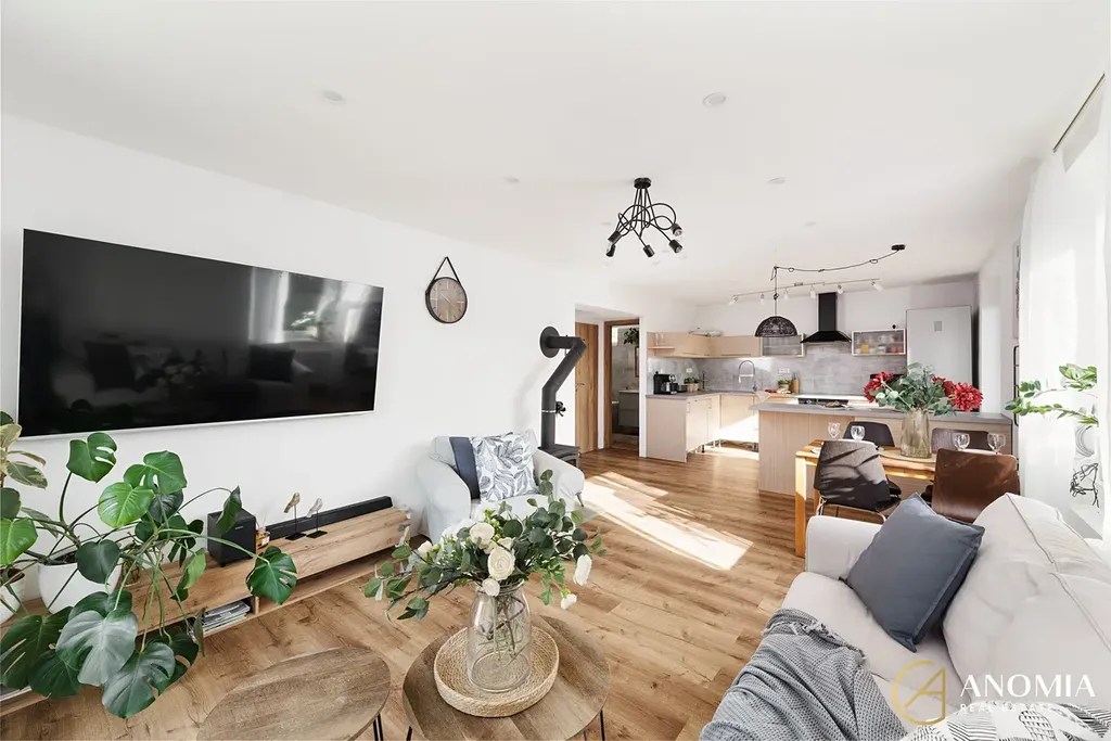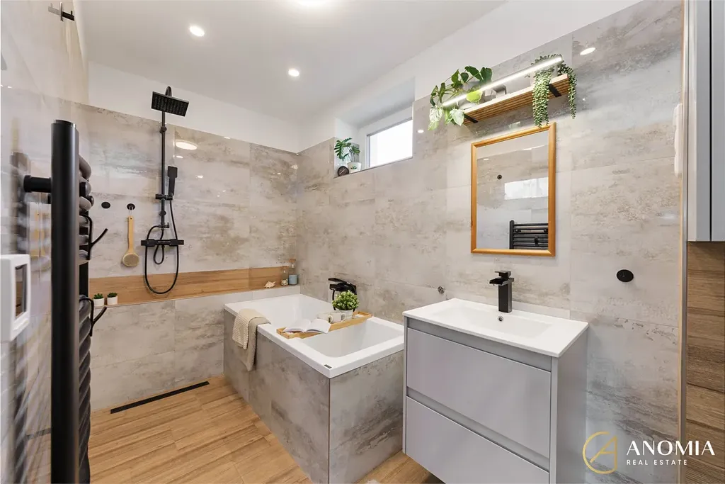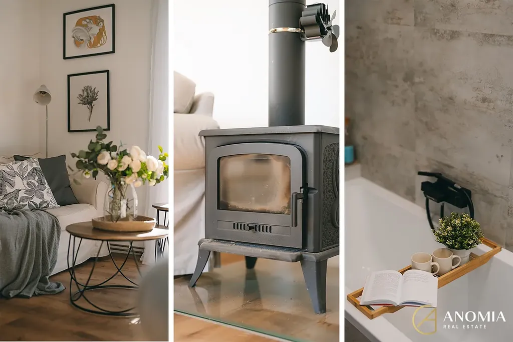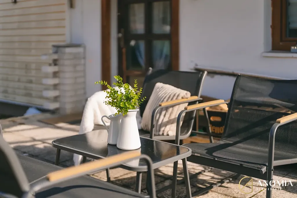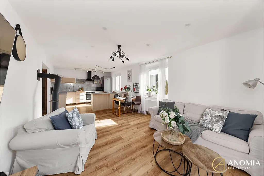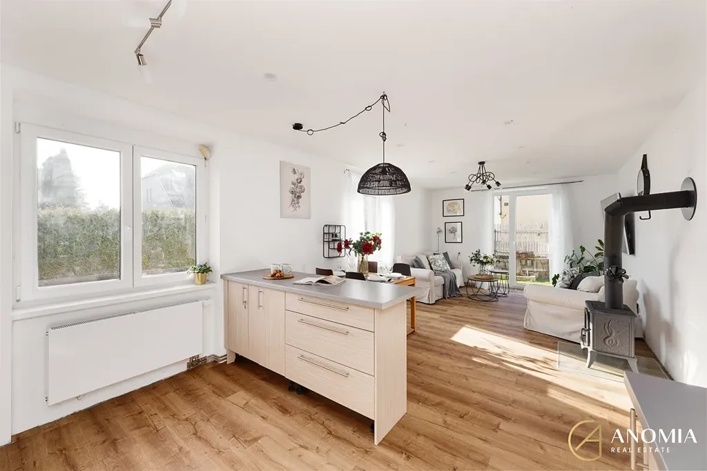 Srdcem domu je světlý obývací prostor propojený s plně vybavenou kuchyní. Velká okna a jihovýchodní orientace zajišťují dostatek přirozeného světla během celého dne. Dominantním prvkem interiéru jsou nová litinová krbová kamna, která vytvářejí příjemnou atmosféru a dodávají prostoru charakter. V přízemí se dále nachází ložnice s prostornou vestavěnou skříní, moderní koupelna s vanou, samostatné WC a technická místnost. Komfort bydlení doplňují kvalitní vinylové podlahy.