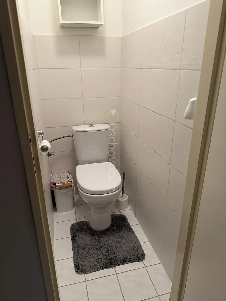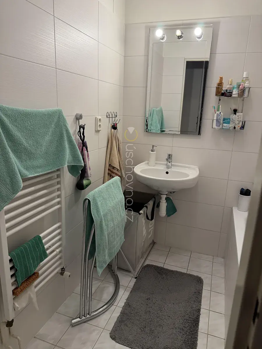 Součástí bytu je koupelna s vanou a umyvadlem a samostatné WC. V bytě je vlastní plynový kotel, který zajišťuje vytápění i ohřev vody.