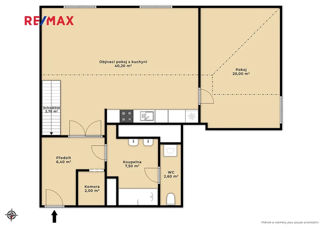 V tomto podlaží se dále nachází pokoj, koupelna a samostatné WC. Koupelna, toaleta i vstupní chodba prošly rekonstrukcí na konci roku 2025.
