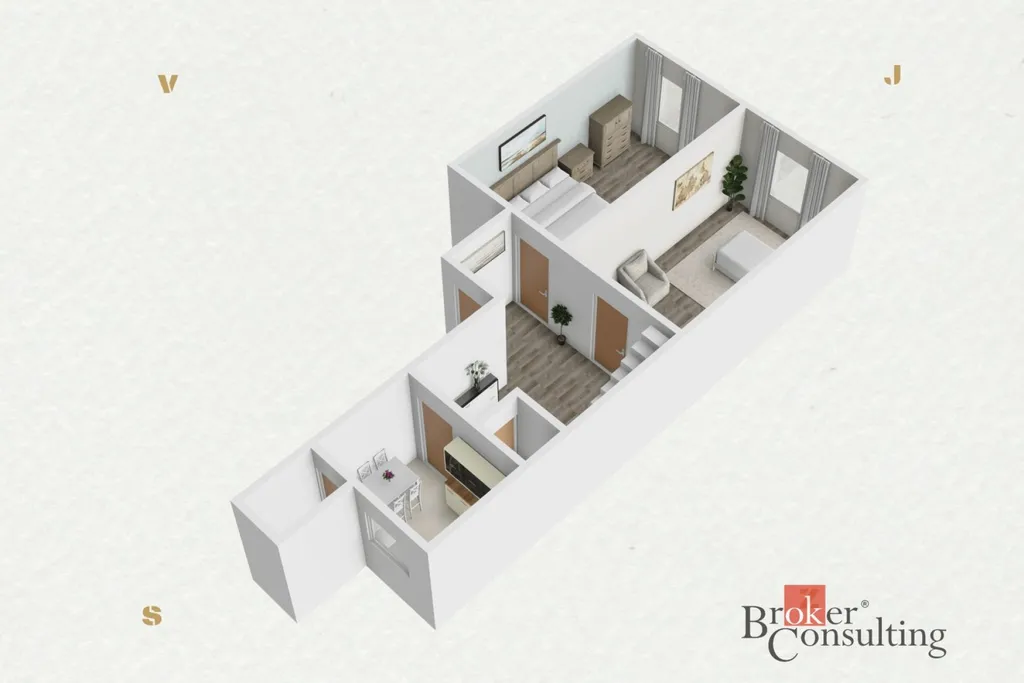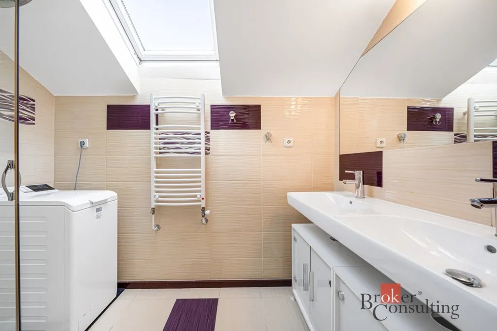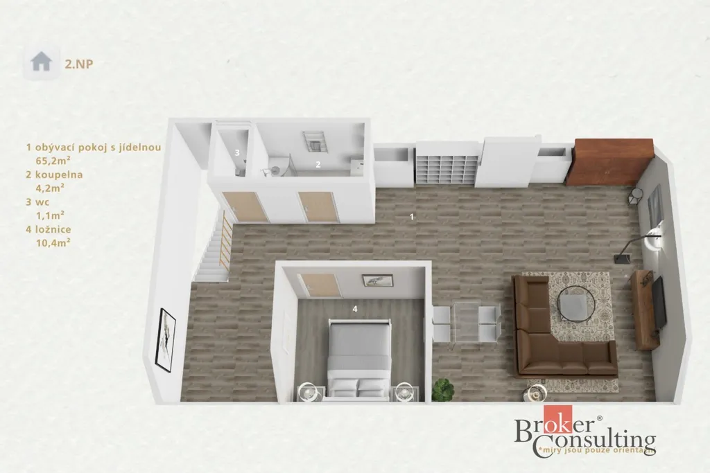 Byt díky mezonetovému uspořádání působí mimořádně vzdušně – klidové místnosti jsou oddělené od hlavního obytného prostoru, což ocení větší rodina i náročnější uživatelé, kteří pracují převážně z domova.