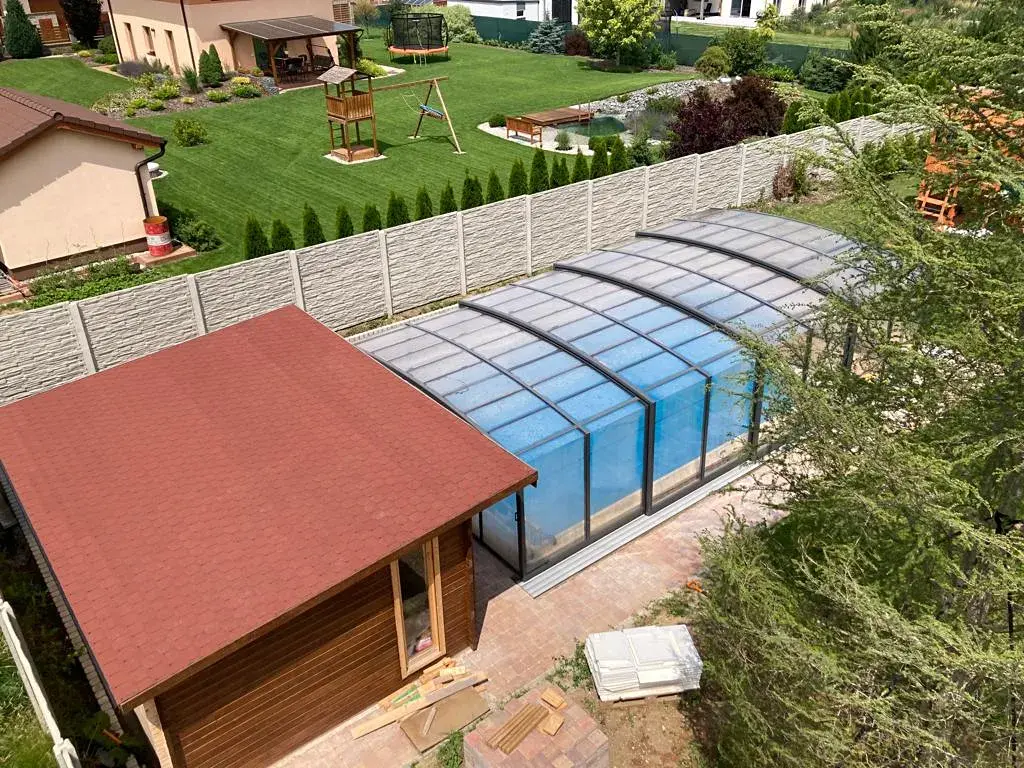 Hostovsky domek nabízí menší dispozici 1+kk, saunu a přímý vstup k nadstandardnímu bazénu Compass o velikosti 7,6 × 3,6 m. Bazén je proveden v designu Brilliant 74 Brava Nova Perl, který vytváří unikátní 3D efekt vody. Díky bezrámovému zastřešení Alukov Vision je možné bazén využívat i v chladnějších měsících. Ohřev i chlazení vody zajišťuje invertorové tepelné čerpadlo Rapid 13 kW s WiFi ovládáním, funkční i při minusových teplotách.