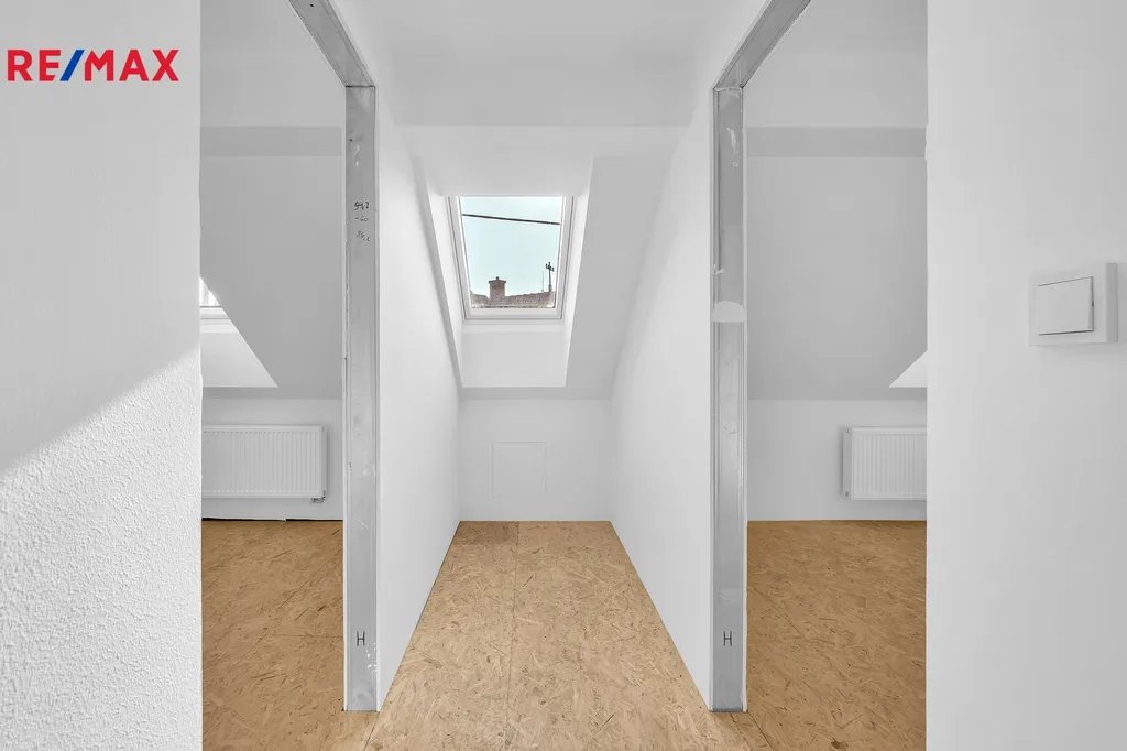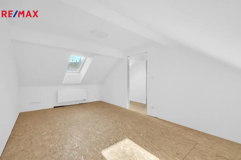 Ložnice v patře budou předány s dokončenými dveřmi, podlahy jsou na výběru kupujícího. Kuchyň je připravena k instalaci – k dispozici je vizualizace interiéru, která kupujícímu umožní přizpůsobit prostor svým představám.