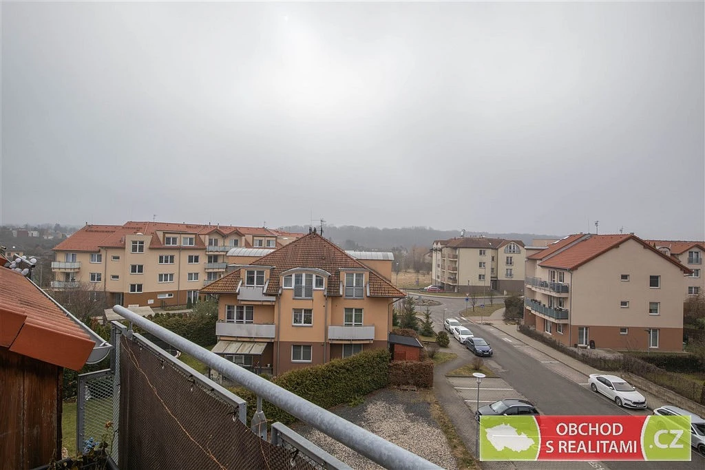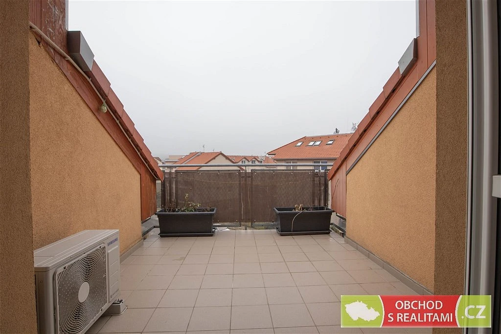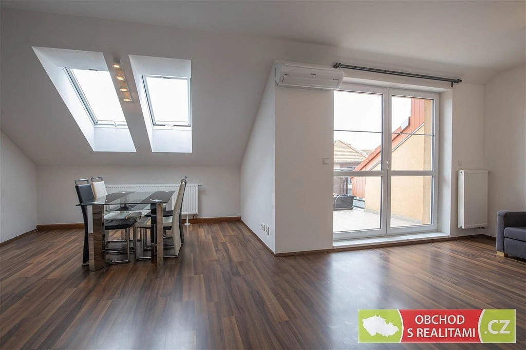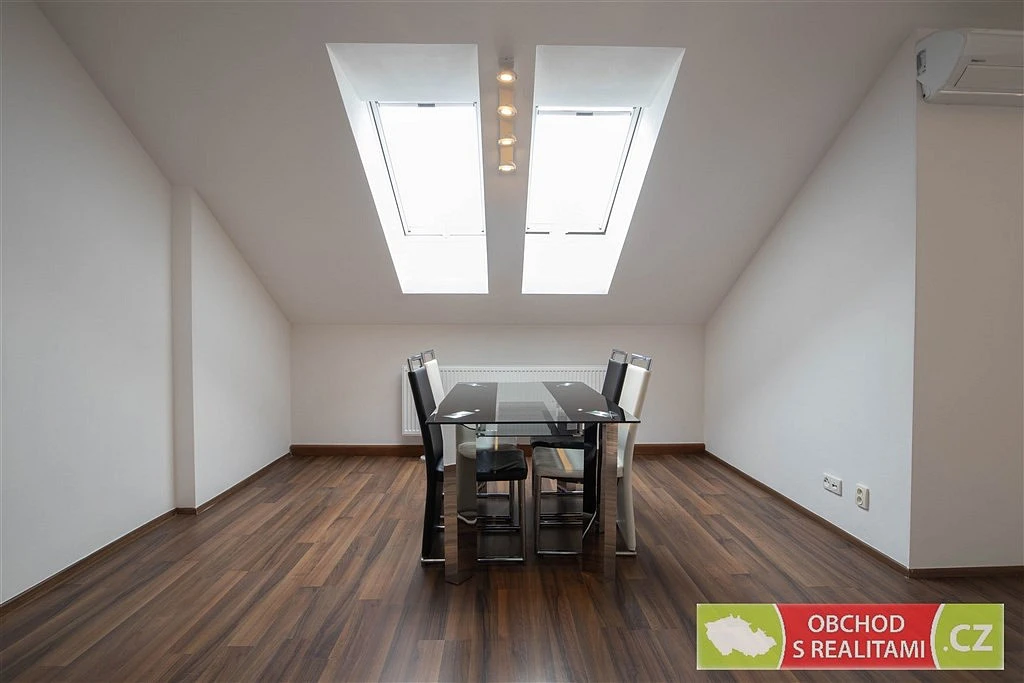Jedná se o podkrovní byt s terasou, na které naleznete soukromí, k dispozici je i markýza, tedy s možností zastínění. Byt zůstává vybavený skříní v obývacím pokoji, kuchyňskou linkou, která je vybavena myčkou nádobí, elektrickou troubou, sklokeramickou varnou deskou a digestoří, dále je v ložnici velká šatní skříň, manželská postel a komoda, v koupelně je pračka, v předsíni se nachází nábytek na míru. V obývacím pokoji je instalována klimatizace. Vše dle přiložené fotodokumentace. Dispoziční plán bytu přikládáme.