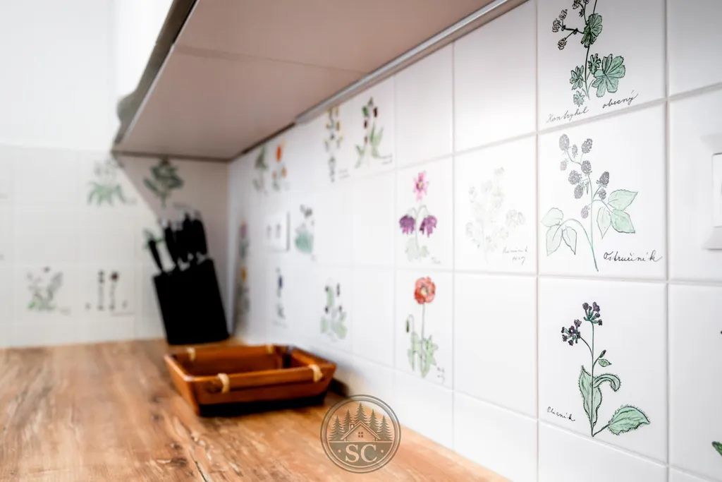 Interiér je řešen s citem pro detail i pro atmosféru hor. Dominantou kuchyně je kuchyňská linka vyrobená na míru, doplněná ručně malovanými obklady s motivy divokých bylin, které přirozeně odkazují na okolní krušnohorskou krajinu.