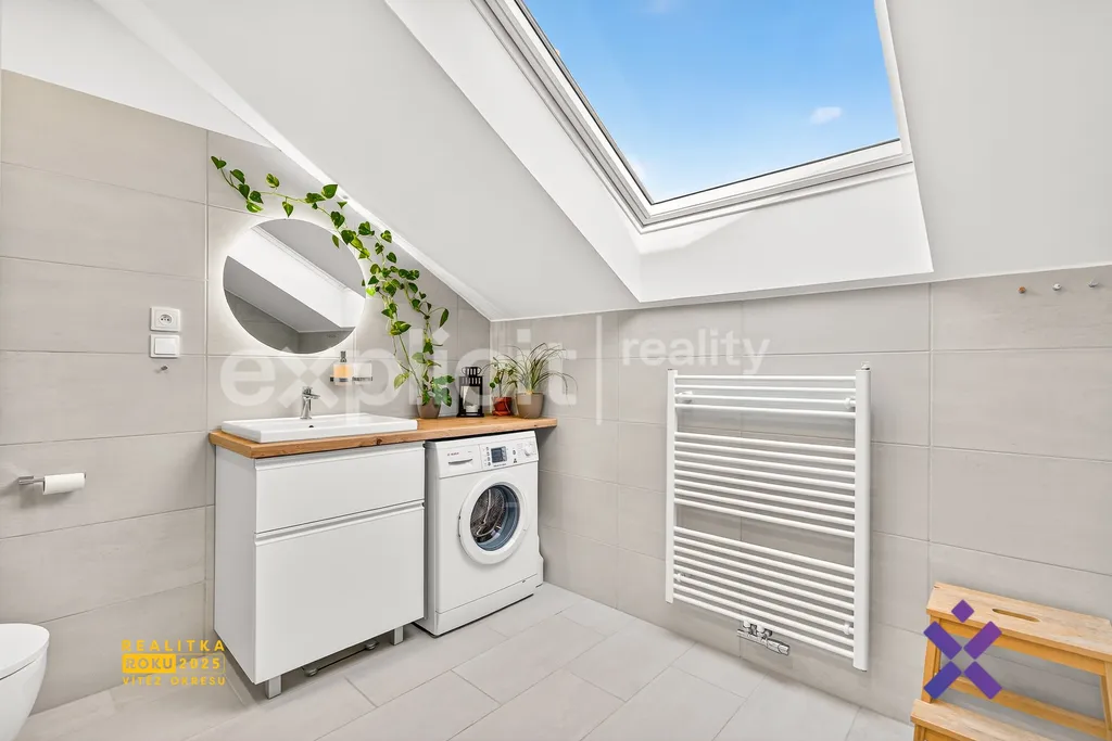 V horním patře jsou situovány další tři místnosti – ložnice, pokoj a pracovna se šatnou. Součástí patra je také prostorná koupelna s vanou a druhou toaletou.