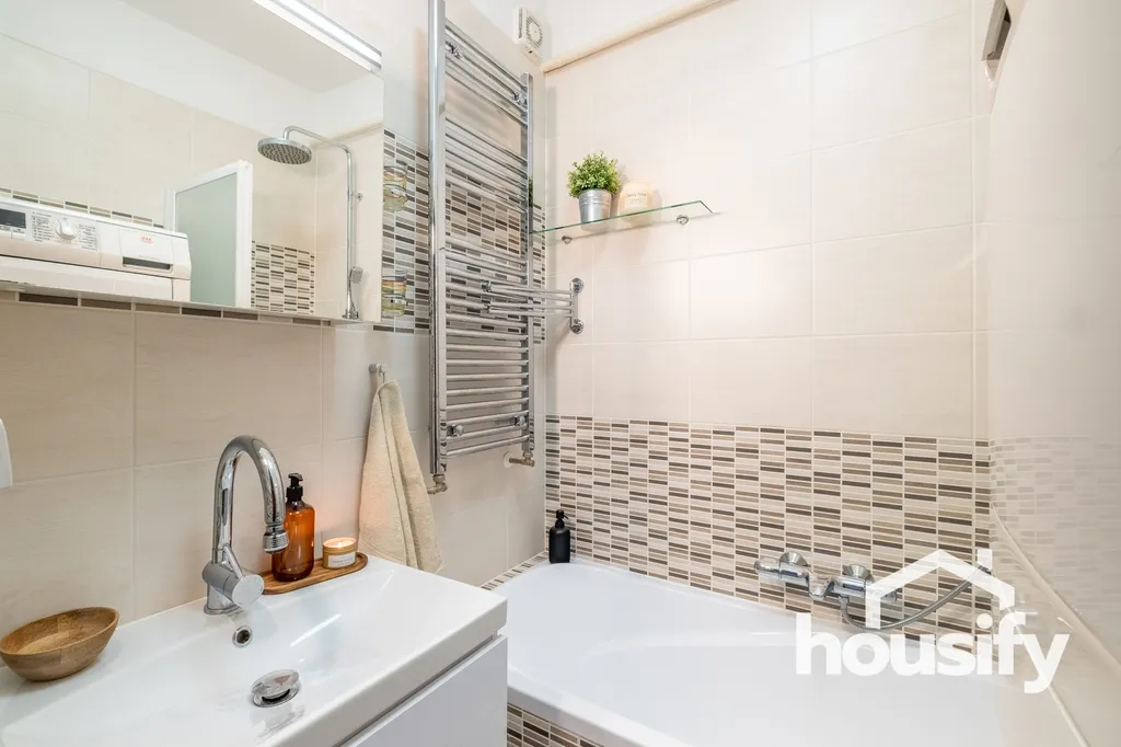 Dispozice zahrnuje předsíň s úložným prostorem, koupelnu s vanou, umyvadlem, kosmetickou skříňkou, pračkou a sušičkou a samostatnou toaletu. Dále předsíň navazuje na moderní kuchyň s jídelním koutem. Kuchyňská linka je vybavena lednicí, troubou, indukční deskou i myčkou. Kuchyně plynule navazuje na dva samostatné pokoje. Bonusem je balkon, který poskytuje prostor pro odpočinek. Příjemnou teplotu v bytě i v létě zajistí klimatizace, která se nachází v kuchyni.