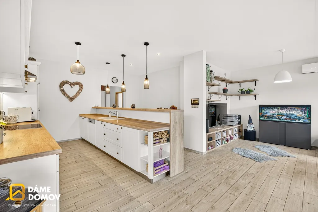 Dům je zděný, zateplený, okna s izolačními 3-skly, venkovní žaluzie, podlahové vytápění, klimatizace, prostorná kuchyňská linka na míru s vestavěnými spotřebiči a barovým pultem.