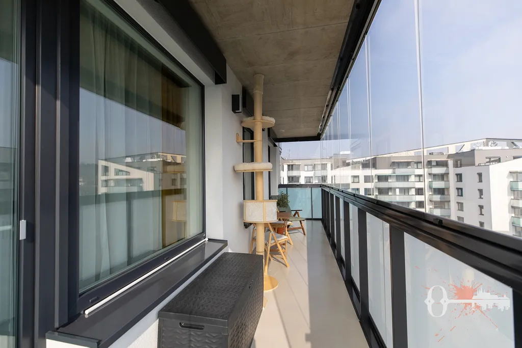 Dominantou bytu je velkorysý balkon o velikosti 12 m² s krásným otevřeným výhledem a dostatkem prostoru pro pohodlné posezení i odpočinek. Balkon je zasklený a doplněný elegantními plisé roletami, takže se z něj stává příjemné místo pro ranní kávu, večerní relaxaci i klidné chvíle během dne téměř po celý rok. V bytě je navíc připravena instalace pro předokenní rolety, které mohou komfort bydlení ještě zvýšit.
