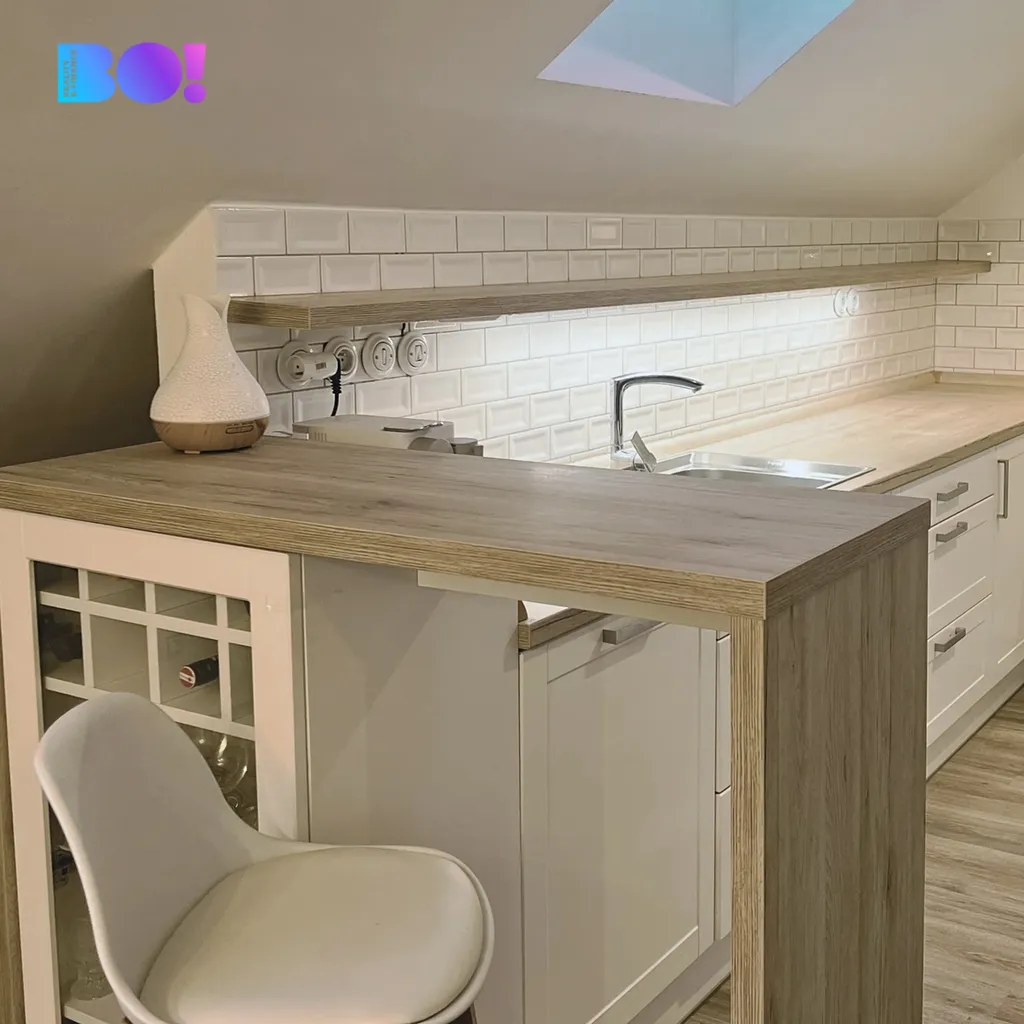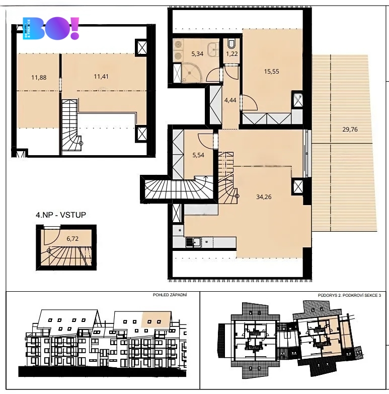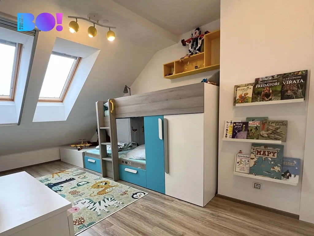 Dispozice 2+kk s otevřenou galerií a samostatným pokojem působí velmi vzdušně a díky střešním oknům je byt po celý den příjemně prosvětlený.