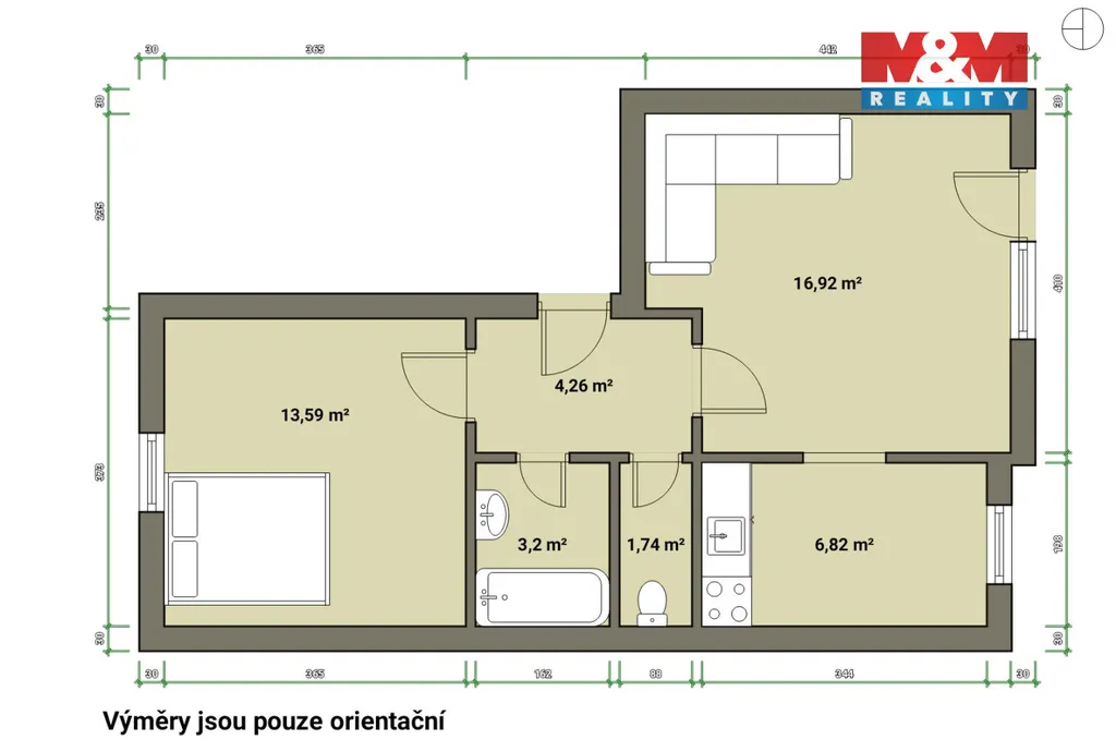 Byt je situován v 1. nadzemním podlaží cihlového domu se čtyřmi nadzemními a jedním podzemním podlažím. Dispozice nabízí obývací pokoj s kuchyňským koutem, samostatnou ložnici, koupelnu, oddělené WC a předsíň. Byt působí velmi prakticky a je vhodný jak pro vlastní bydlení jednotlivce či páru, tak také jako investiční nemovitost s možností dlouhodobého i krátkodobého pronájmu.