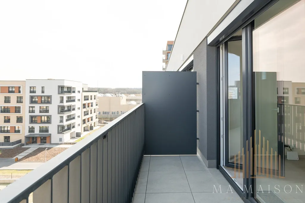 Byt se nachází v 5. patře a disponuje světlým obytným prostorem s kuchyňským koutem, který je vybaven moderními spotřebiči, jako je elektrická trouba, varná deska, digestoř, lednice a myčka na nádobí. V předsíni se nachází vestavěná šatní skříň. Koupelna je vybavena sprchovým koutem, umyvadlem, WC a zrcadlem s osvětlením.