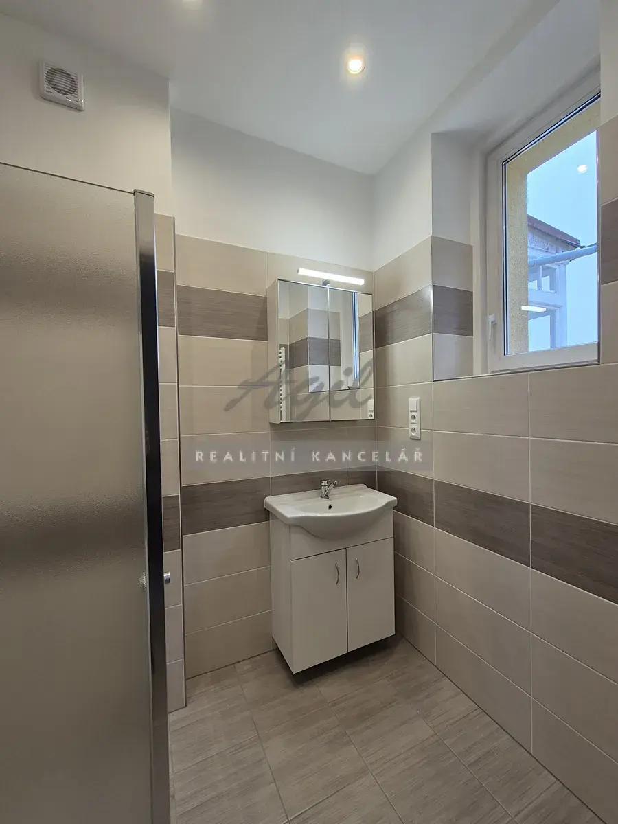 Koupelna – umyvadlo se spodní skříňkou, zrcadlová nástěnná skříňka s osvětlením, přípojka na pračku, otopný el.žebřík.