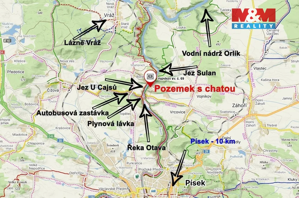 Nabízíme rekreační objekt na pozemku o výměře 1 513 m² v klidné rekreační lokalitě Vojníkov u Písku, jen pár kroků od řeky Otavy. Místo nabízí soukromí, krásnou přírodu, rybaření, vodní sporty i odpočinek mimo ruch města. Dle územního plánu je pozemek určen pro individuální rekreaci se zastavitelností až 35 % (cca 530 m²). Na pozemku se nacházejí dvě původní rekreační stavby určené k odstranění (zastavěná plocha 311 m²), což umožňuje realizaci nového projektu dle vlastních představ. Možnost zajištění likvidace – cena není zahrnuta v prodejní ceně. K dispozici je elektřina 230/400 V, vlastní studna a jímka. Pozemek je mimo záplavovou zónu a přístupný po zpevněné obecní komunikaci. Lokalita se nachází pár metrů od jezu, kde začíná Orlická přehrada. Vhodné pro rekreační dům či chalupu i k celoročnímu užívání. Praha cca 1 hodina po D4, Písek několik minut autem. Dokumentace k dispozici. Cena 1 750 Kč/m². Pro více informací a prohlídku nás kontaktujte.
