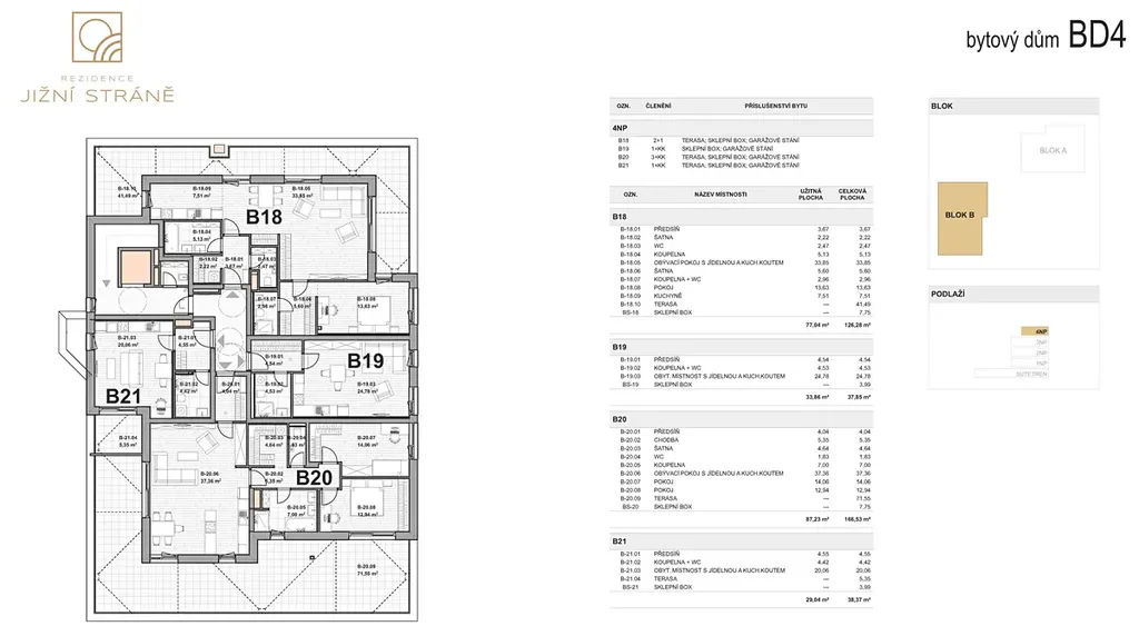 Ve třetí etapě vznikne bytový dům BD4 o dvou blocích A a B propojených suterénním parkovištěm s celkem 39 byty. V rámci této etapy nabízíme k prodeji byt o dispozici 1+kk s užitnou plochou 34 m² ve 4.NP bloku B.