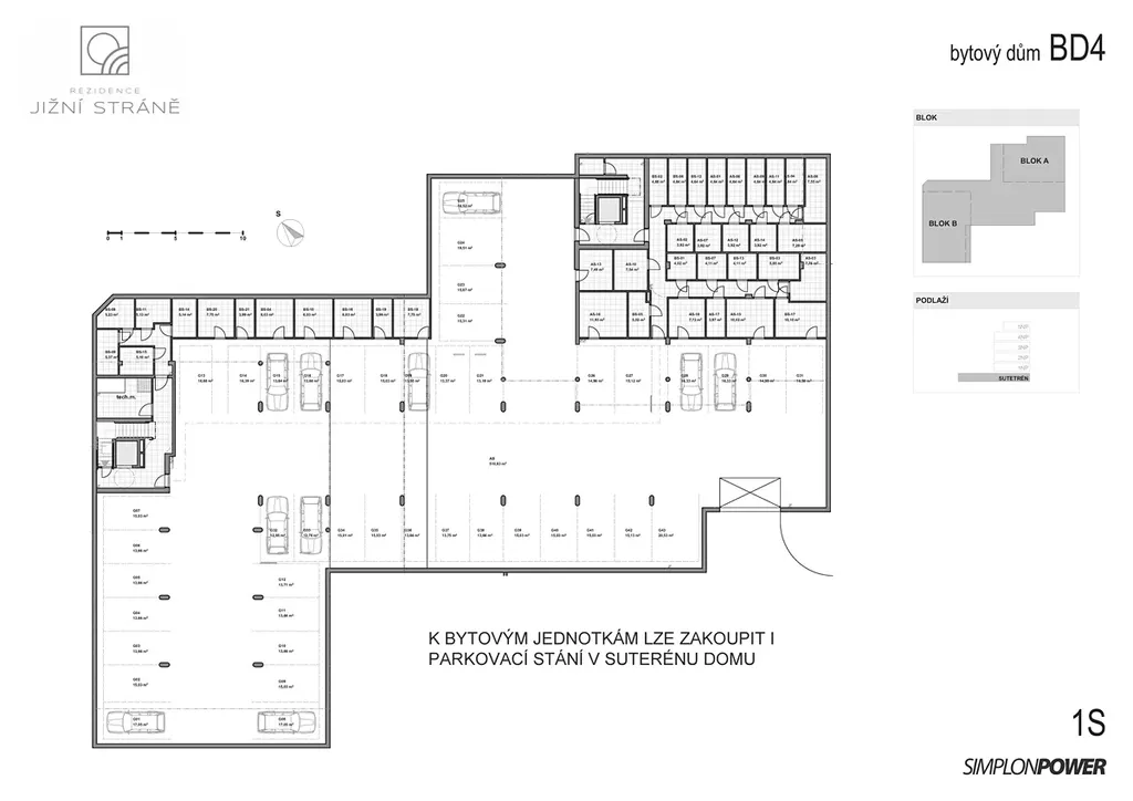 K bytu je možné dokoupit parkovací stání v suterénu domu.
