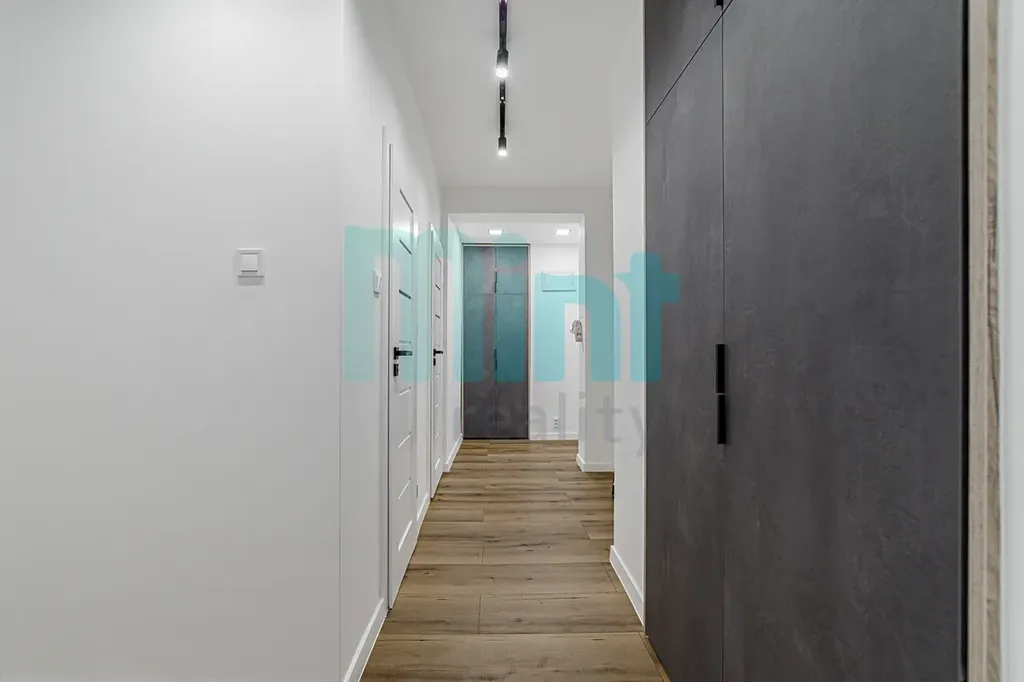 Chodba disponuje dvěma vestavěnými skříněmi vyrobenými na míru od stolaře a moderními interiérovými dveřmi s obložkami, které doplňují celkový styl bytu.