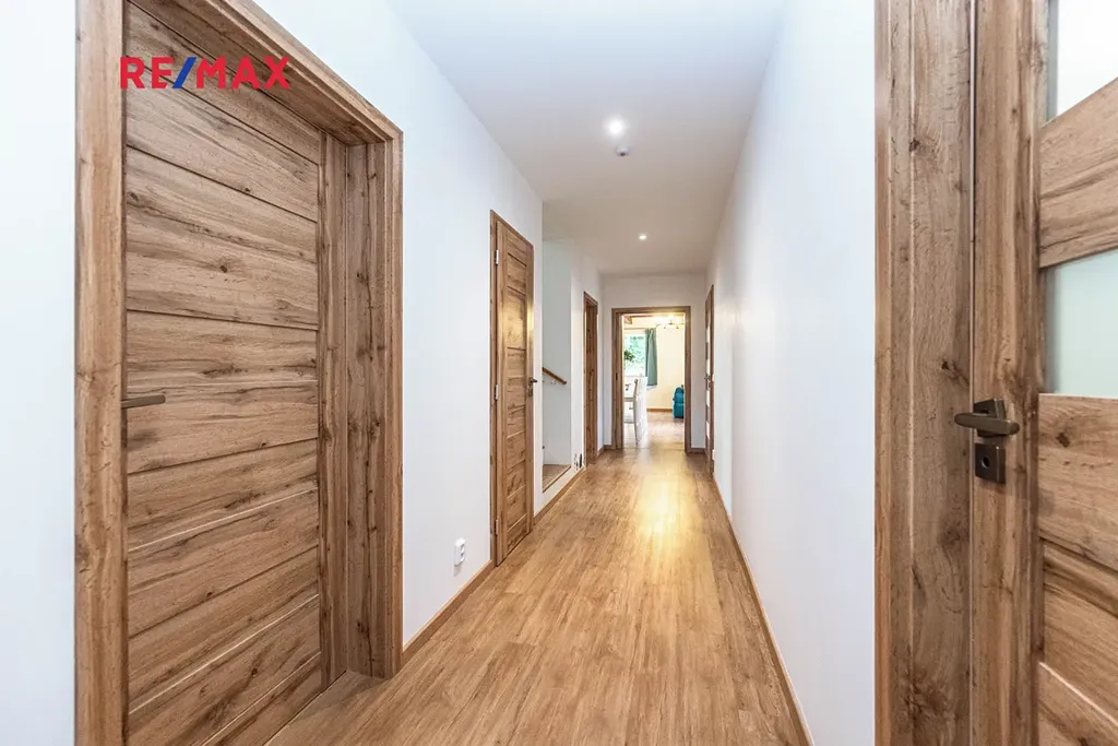 Interiér domu kombinuje kvalitní materiály, vkusné zařízení a praktické řešení – dřevěné stropy, designové koupelny, prostorné úložné prostory a vestavěné šatny.