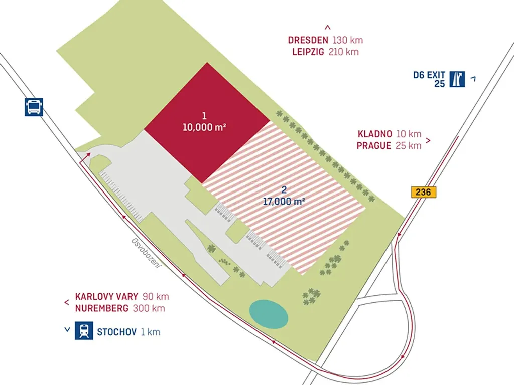 Logistický areál P3 Prague D6 se nachází na exitu 25 dálnice D6 (Praha - Karlovy Vary - Německo), je vzdálen 20 min od Prahy. Areál je dobře viditelný. Současným nájemcem je například spol. Arvato Services. Konkrétní dostupnost prostor na dotaz. Volná část haly DC2 - sklad 6564 m2 + 459 m2 kanceláře se zázemím.
