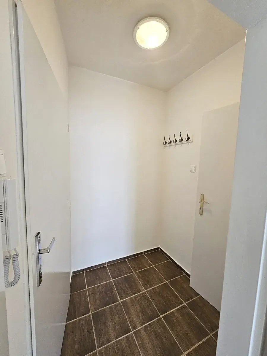 V bytě se nachází obývací pokoj s kuchyňským koutem a spíží (17 m2, kombinovaný sporák, menší lednice, digestoř) + ložnice (14 m2) + koupelna s vanou (3 m2) + samostatné WC + předsíň.