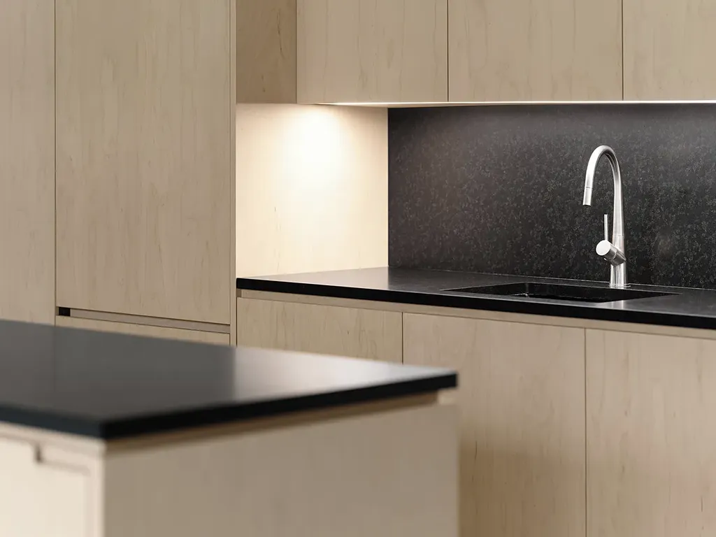 V přízemí se odehrává každodenní život. Otevřený obytný prostor s kuchyní a jídelnou plynule navazuje na terasu a zahradu velkoformátovým prosklením. V teplejších měsících se dům přirozeně otevře ven a život se rozprostře mezi interiérem a zahradou, bez plánování a bez velkých gest. Je to prostor, který funguje v běžný den i ve chvíli, kdy si chcete pozvat přátele.