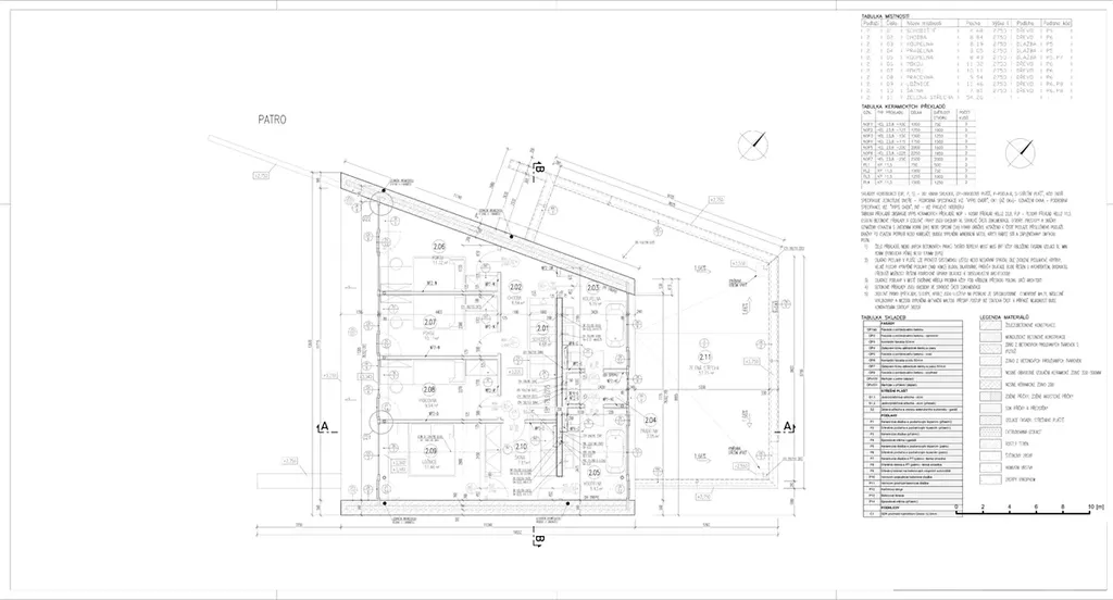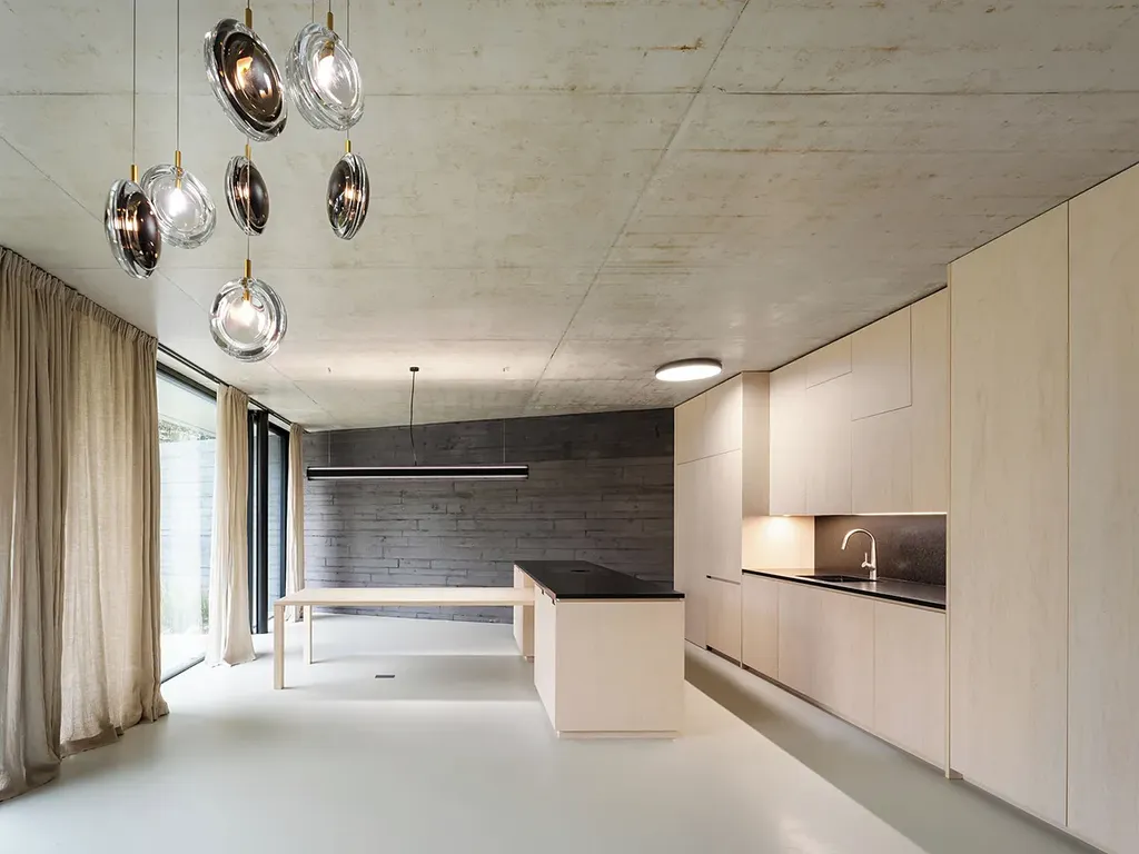 Materiálově je interiér vyvážený. Pohledový beton dává prostoru pevnost a klid; dřevo a vestavby z březové dýhy ho změkčují a dělají ho příjemným pro každodenní život. Nepůsobí studeně ani přezdobeně. Je to prostředí, které vás nebude unavovat a které si bez problémů vezme váš vlastní styl. Bezfalcové dveře, podlahové vytápění, tepelné čerpadlo a energetická třída B odpovídají standardu, který u takového domu očekáváte.