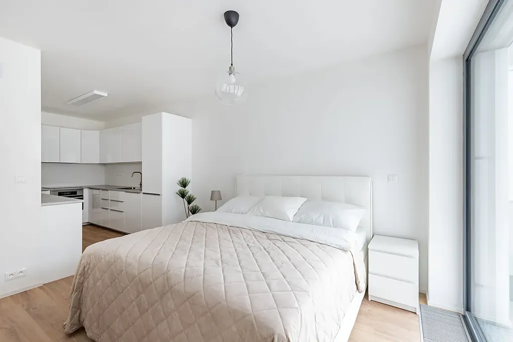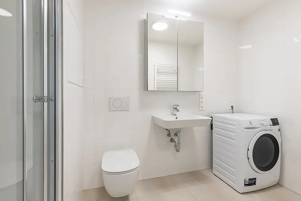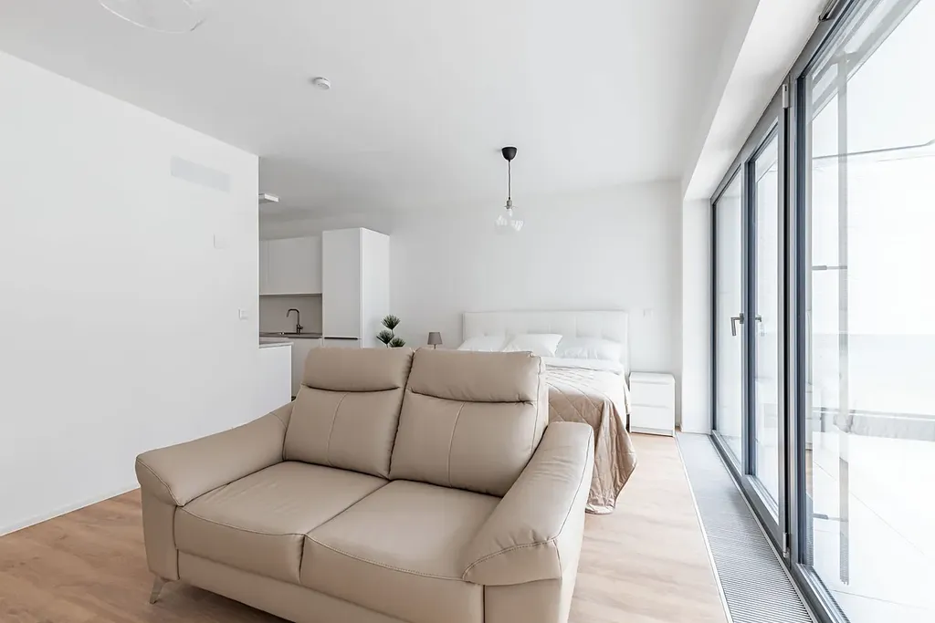 Klimatizace, kuchyňská linka se spotřebiči – myčka, varná indukční deska, horkovzdušná trouba kombinovaná s mikrovlnnou troubou, digestoř s odtahem, lednice s mrazákem, dále pak kožená pohovka, TV, stolek pod TV, stůl a dvě židle, dvojlůžko s úložným prostorem, koupelna se sprchovým koutem, pračka se sušičkou, zrcadlová galérka, vestavěné šatní skříně ve vstupní chodbě a v ložnici, stojací lampa, stolní lampička, venkovní předokenní žaluzie a bezpečnostní vstupní dveře, modem s Wifi.