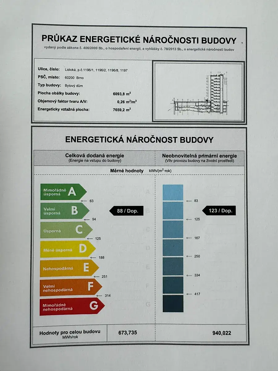 Budova má nízkou energetickou náročnost (B), v celé budově jsou izolační trojskla s velmi dobrou tepelnou i zvukovou izolací a v domě jsou použity mezibytové akustické příčky.