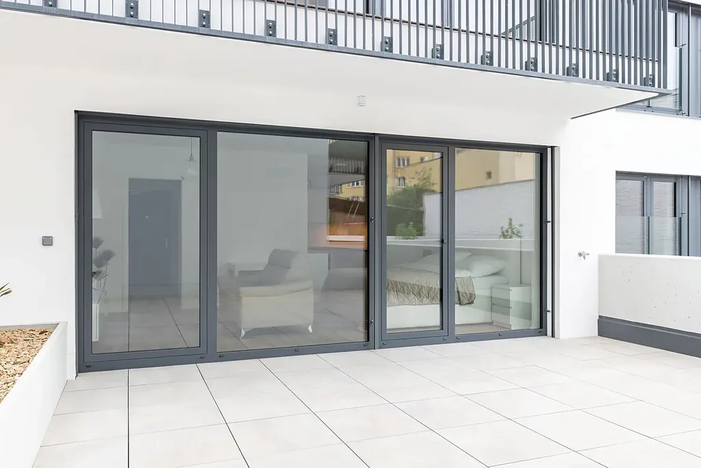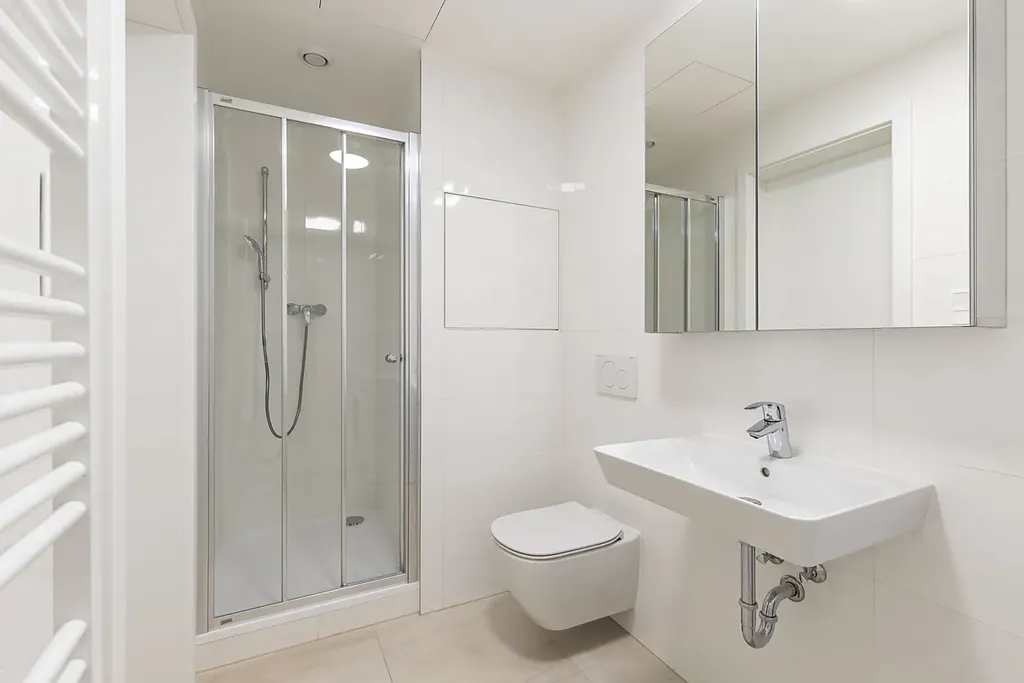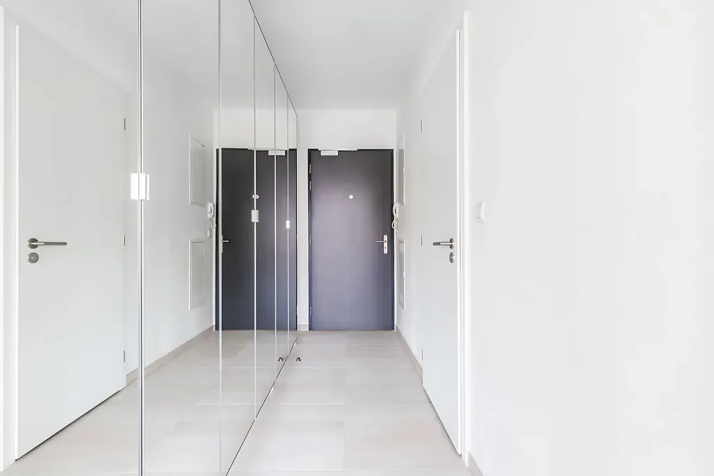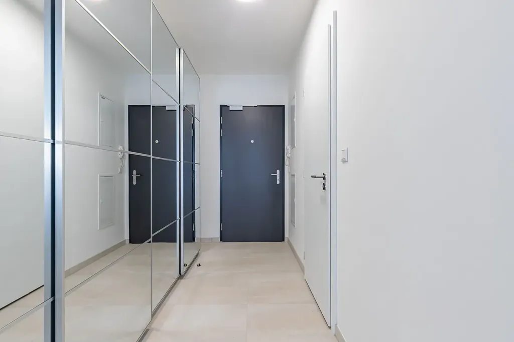 Byt má okna s trojsklem, předokenní žaluzie a klimatizaci, které zajišťují vysoký komfort bydlení po celý rok.