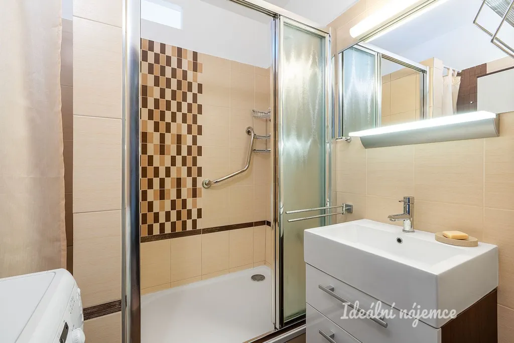 Obývací pokoj je částečně vybaven a je klimatizován z tohoto pokoje lze vstoupit na balkon. Druhý pokoj, který lze využít jako ložnici či pracovnu, je rovněž částečně zařízen – najdete zde šatní skříň a police pro uskladnění věcí. V ložnici je manželská postel a prostorná šatní skříň. Koupelna je kompletně vybavena – prostorných sprchovým koutem a koupelnovou skříňkou, umístěnou nad umyvadlem, součástí je i pračka. Toaleta se nachází odděleně. Na chodbě bytu se nachází další praktický úložný prostor, který ocení každý nájemce.