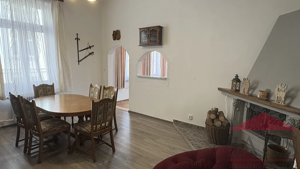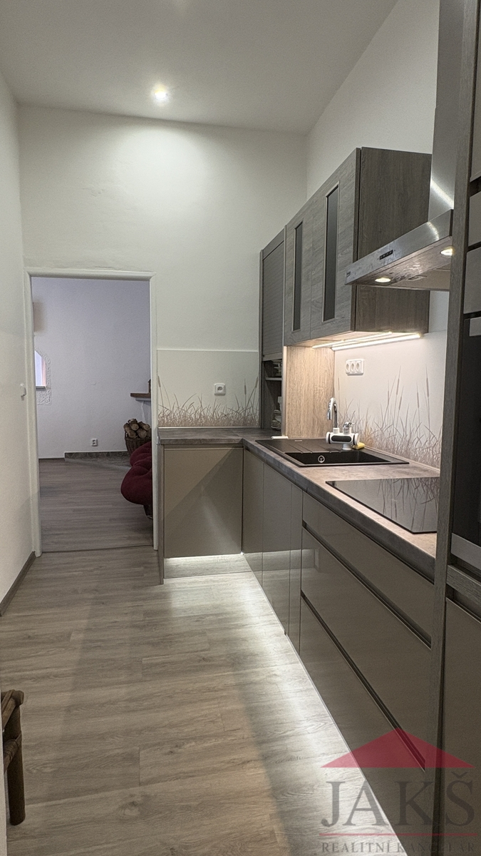 Popis: spol. chodbička; koupelna (sprchový kout, umyv. se zrcadlem, WC, el. boiler, elektrokotel, pračka) s oknem, samostatné WC s umyvadlem, průchozí kuchyň 16 m2 s (moderní kuch. linka s vestavěnými spotřebiči: HV trouba, sklo-ker. deska, digestoř, myčka, spíž), mezonetová ložnice (mezonetové dřev. patro na spaní), manželská ložnice, průchozí jídelna s krbem 25 m2 a hlavní obývací pokoj 25 m2. Prodej vč. veškeré bytového vybavení (vč. lůžkovin, záclon...), zařízení (vč. spotřebičů) a dekorativních prvků (zbraně, obrazy, fajfky...).