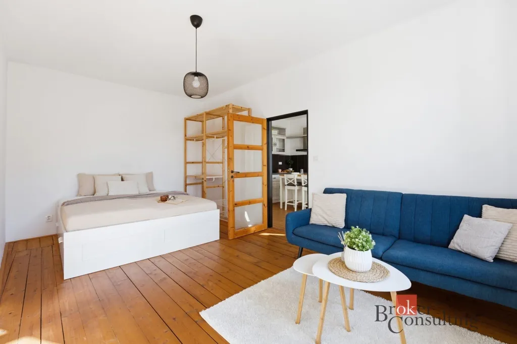 Díky vysokým stropům a velkým oknům je byt vzdušný a prosvětlený. Interiér kombinuje dřevěné podlahy, světlé stěny a moderní vybavení, což vytváří příjemnou a nadčasovou atmosféru.
