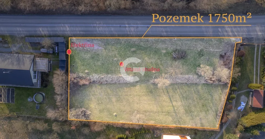Velkou výhodou je připravenost inženýrských sítí přímo na pozemku – k dispozici je elektřina, plyn a vrtaná studna, což výrazně usnadňuje a urychluje budoucí výstavbu.