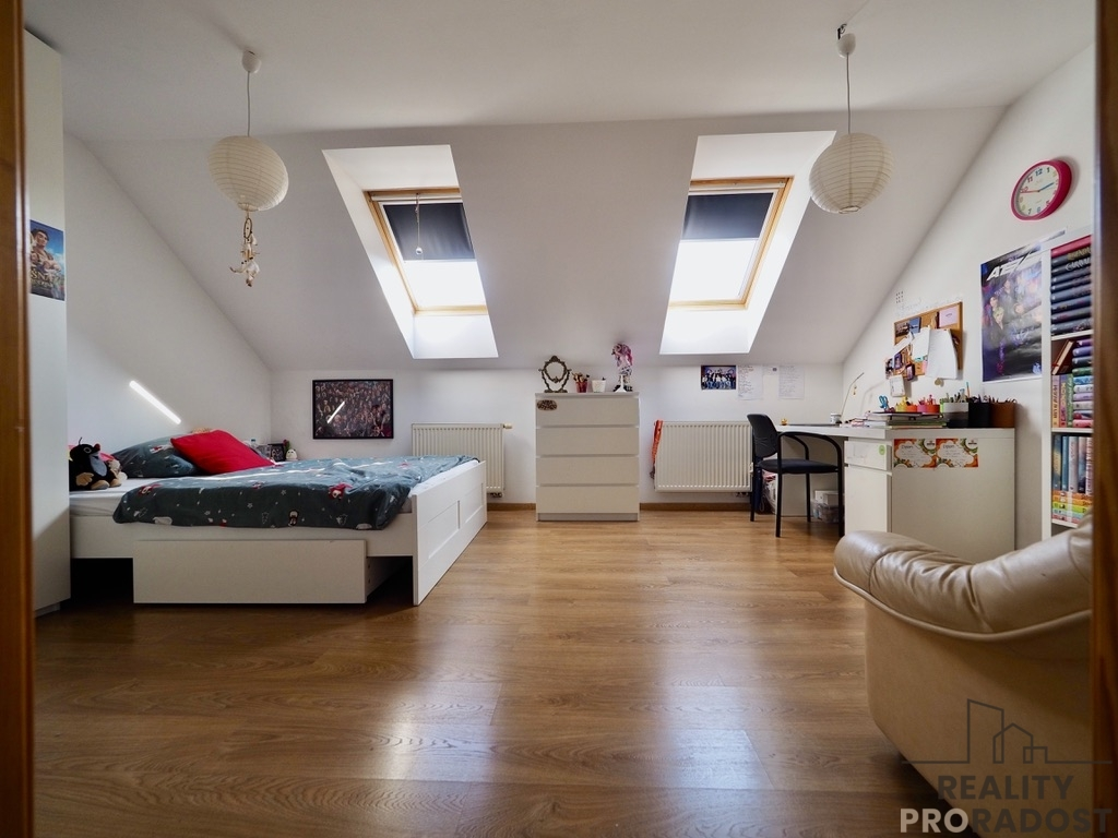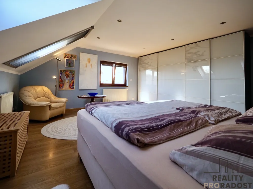 Prodej patrového velice zajímavého rodinného domu o velikosti 4+1, obytná plocha 340m2, garáž s dílnou 63m2, na pozemku 900m2 v Hradečně . Dispozice domu: předsíň se vstupem do technické místnosti s prádelnou a toaletou, prostorná vstupní chodba, prostorná kuchyň se spíží, a jídelnou na jižní stranu navazující na prostornou obývací místnost (120m2), s přímím vstupem dvěma fracouzskými okny na venkovní terasu 30m2, vyloženou venkovními palubkami. Do 1. patra nás dovede samonosné bukové schodiště. V 1. patře jsou 4 pokoje velká koupelna s podlahovým vytápěním se 2. umyvadly, vanou a sprchovým koutem. Obě koupelny jsou vybaveny topnými žebříky. V patře je vstup pomocí skládacího žebříku na půdu, (122 m2) která plochou odpovídá celému vrchnímu patru.