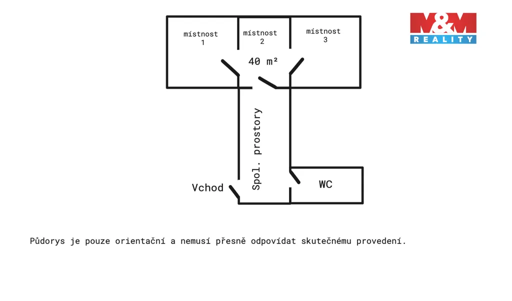 Prostor je dispozičně řešen jako tři místnosti – za hlavními dveřmi se nachází vstupní část vhodná například jako recepce nebo pracoviště pro asistentku, po pravé a levé straně jsou dvě samostatné kanceláře.