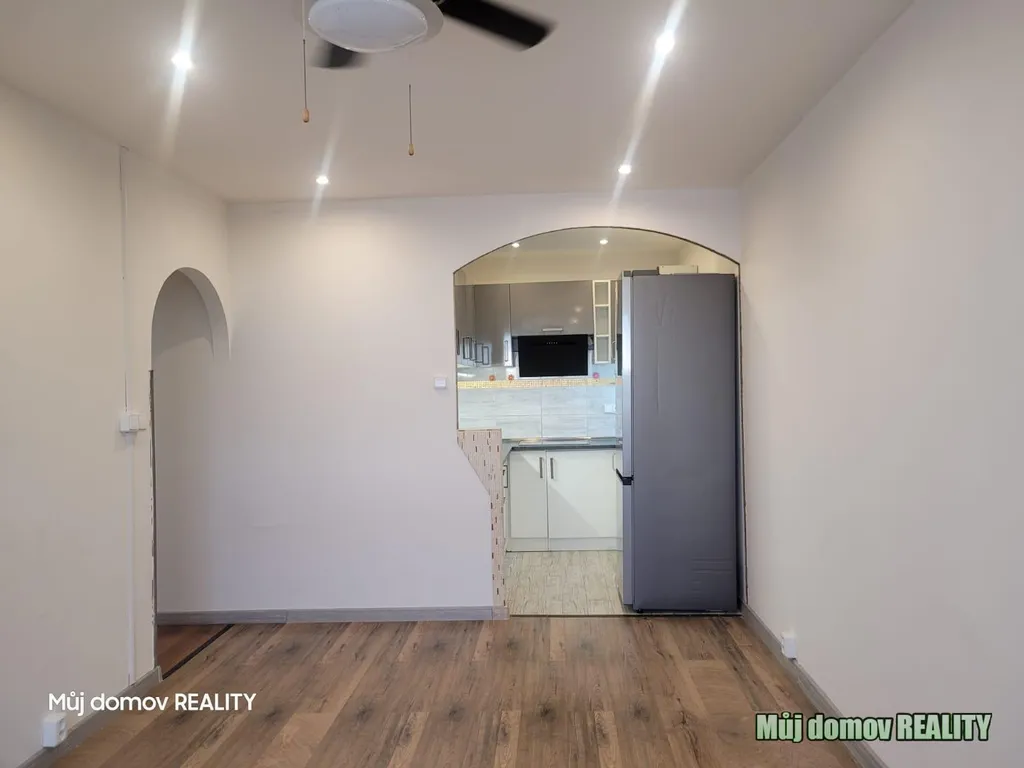 Byt je částečně zařízený k dispozici je plně vybavená kuchyňská linka, lednice, sporák, trouba a dostatek úložných prostor. Chybí pouze postel a sedací souprava.