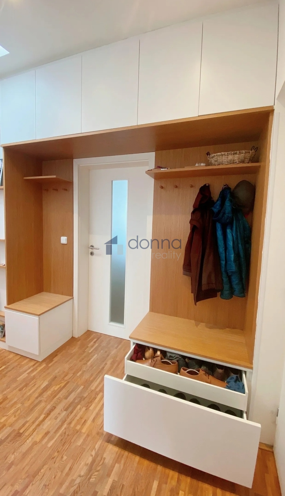 Mnoho úložných prostor ve vestavěných skříních na chodbě a komoře.