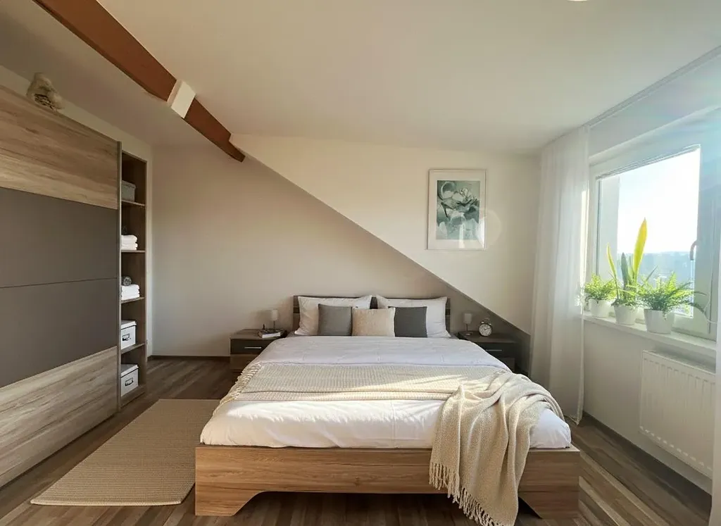 Tento byt vznikl v roce 2000 jako poctivá podkrovní nástavba. Zatímco jinde se bojuje o každý centimetr, tady se na prostoru pro život nešetřilo. Ložnice je tu tak velkorysá, že si v ní klidně postavíte pracovní kout pro dny na home office, nebo sem bez problému umístíte dětskou postýlku, a pořád vám zbude místo na pořádnou šatní skříň. Je to prostor, který se vám přizpůsobí, ne naopak.