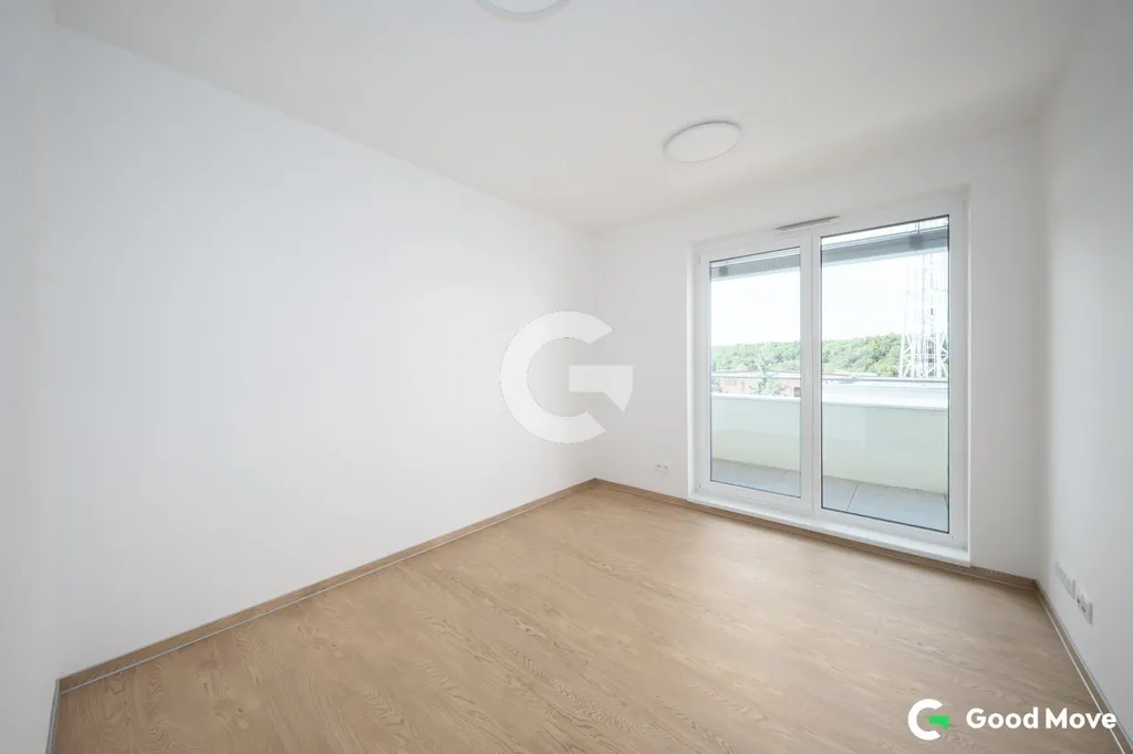 Obývací pokoj je prosvětlený díky velkému francouzskému oknu, které propojuje interiér s exteriérem a přináší do bytu dostatek denního světla. Všechna okna jsou vybavena venkovními žaluziemi, které umožňují regulaci světla i teploty a přispívají k příjemnému klimatu v bytě.