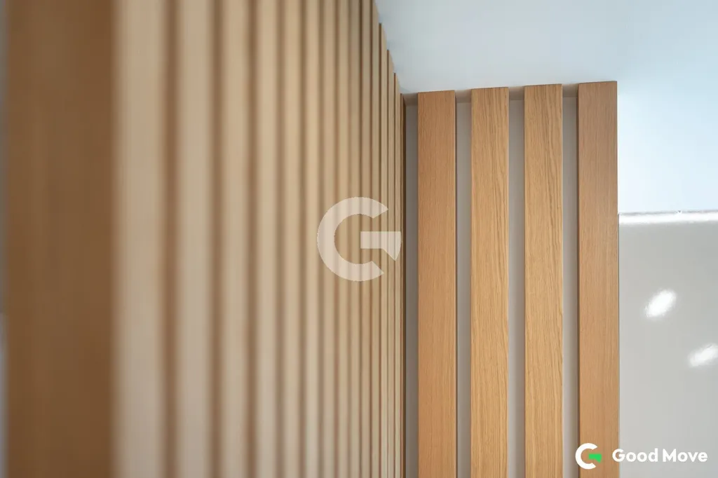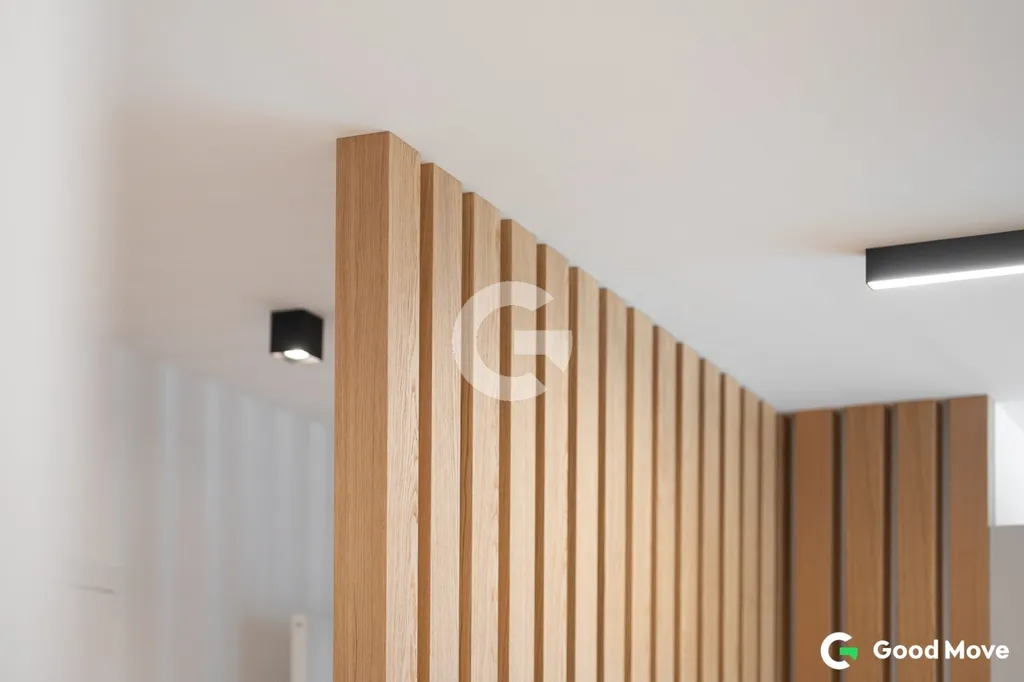 Interiér bytu byl v rámci klientských změn doplněn o řadu nadstandardních prvků, které posouvají úroveň bydlení na vyšší standard. Dominantou obytného prostoru je moderní kuchyňská linka vyrobená na míru od renomované společnosti Minár, vybavená vestavnými spotřebiči AEG a designovou indukční varnou deskou Bora. Celkový dojem prostoru podtrhuje elegantní dřevěná stěna na míru, která dodává interiéru charakter i útulnost.