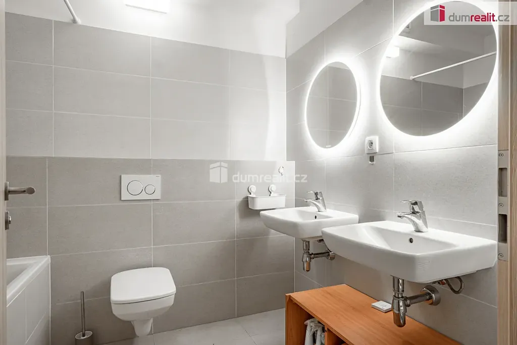 koupelna s vanou, dvěma umyvadly a toaletou
