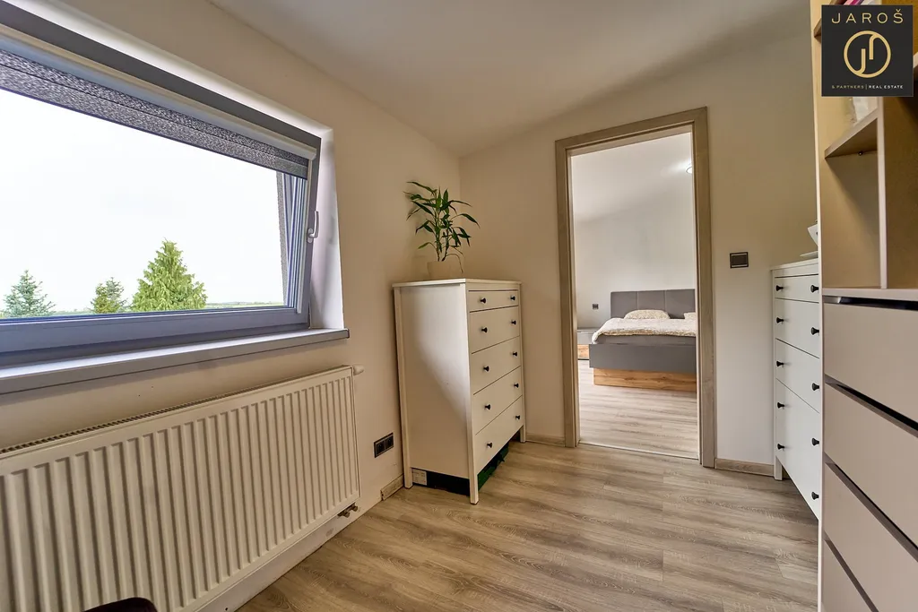 V přízemí se nachází vstupní chodba, koupelna s wc s bidetovou sprškou, umyvadlem a sprchovým koutem, samostatný pokoj, technická místnost a kuchyň s obývacím pokojem s přímým vstupem na zastřešenou terasu. Do patra se dostanete po dubových schodech, kde se nachází hlavní koupelna s vanou. dětský pokoj, ložnice a šatna.