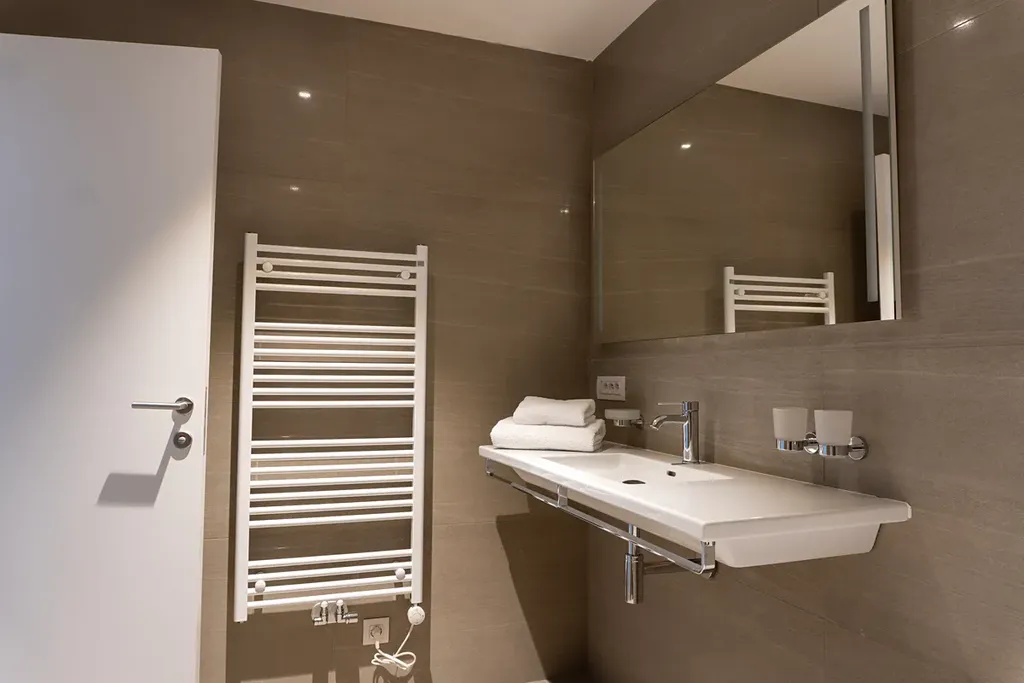 Koupelna je provedena ve vysokém standardu s použitím kvalitních materiálů a součástí bytu je také pračka.