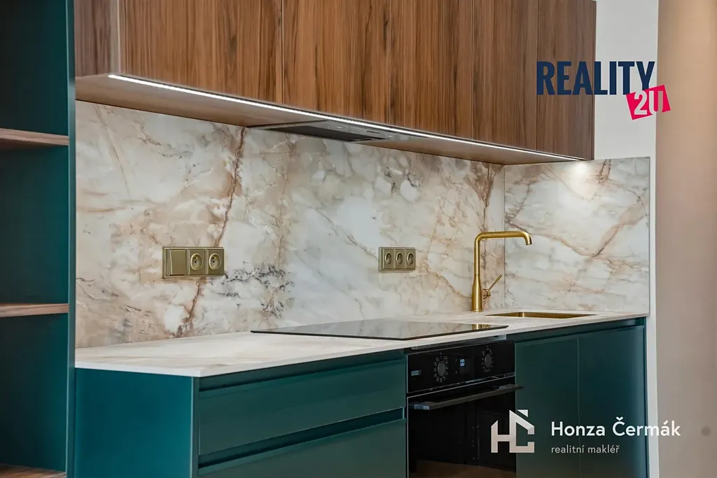 Srdcem bytu je stylová kuchyňská linka vybavená špičkovými vestavnými spotřebiči. K dispozici je myčka, lednice s mrazákem, trouba, indukční deska i výkonná digestoř. Celý prostor je doladěn do posledního detailu včetně elegantního dřezu a mramorového dekoru, který koresponduje s vysokým standardem vybavení. Nechybí ani technické zázemí v podobě pračky a sušičky, které jsou diskrétně zabudovány přímo v bytě v rámci úložných prostor.