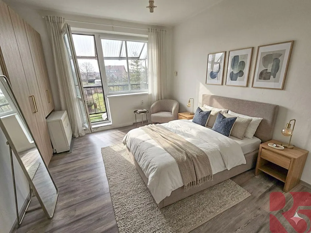 Byt v cihlovém domě je jen 3,5 km od centra Poděbrad a jen 5km od nájezdu na D11, kterou se pohodlně dostanete do Prahy. Dům má 2 podlaží a podkroví, střecha je z pálených tašek.